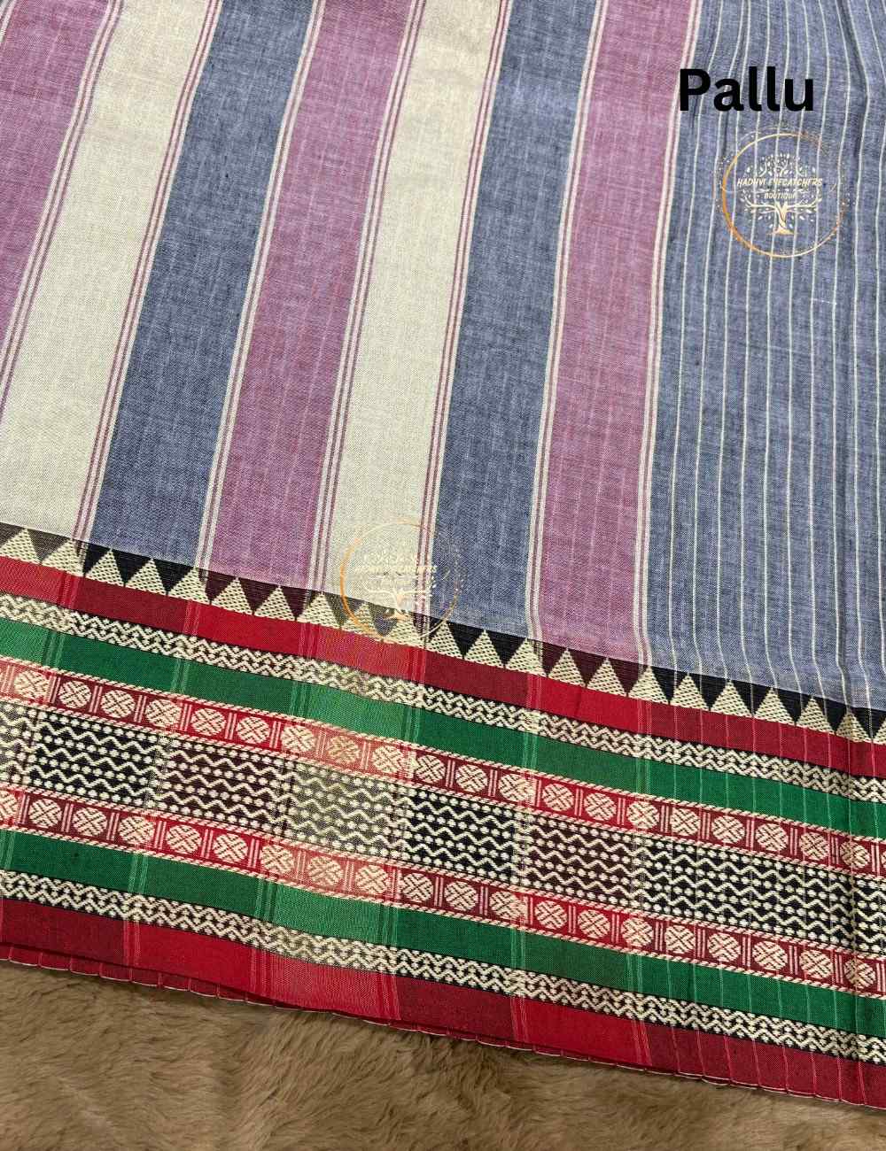 This elegant Narayanpet cotton saree blends minimalism with heritage. The ash grey body is adorned with fine white pinstripes — a classic layout that evokes the rhythm of handlooms and the geometry of temple architecture. The pallu and border burst into vibrant bands of red, green, black, and beige, woven with intricate diamond and triangle motifs that reflect the tribal and temple-inspired artistry of Narayanpet weavers.
