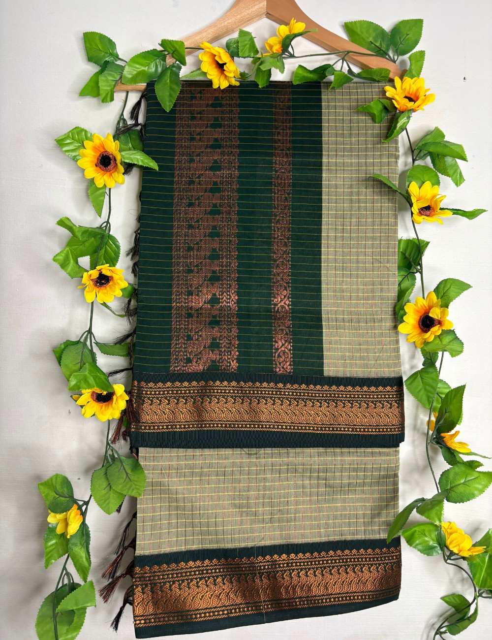 The bottle green border, richly woven with copper zari floral and geometric motifs, adds depth and traditional richness to the muted body. Paired with a matching bottle green blouse, this saree is perfect for women who appreciate natural hues elevated by heritage craftsmanship.