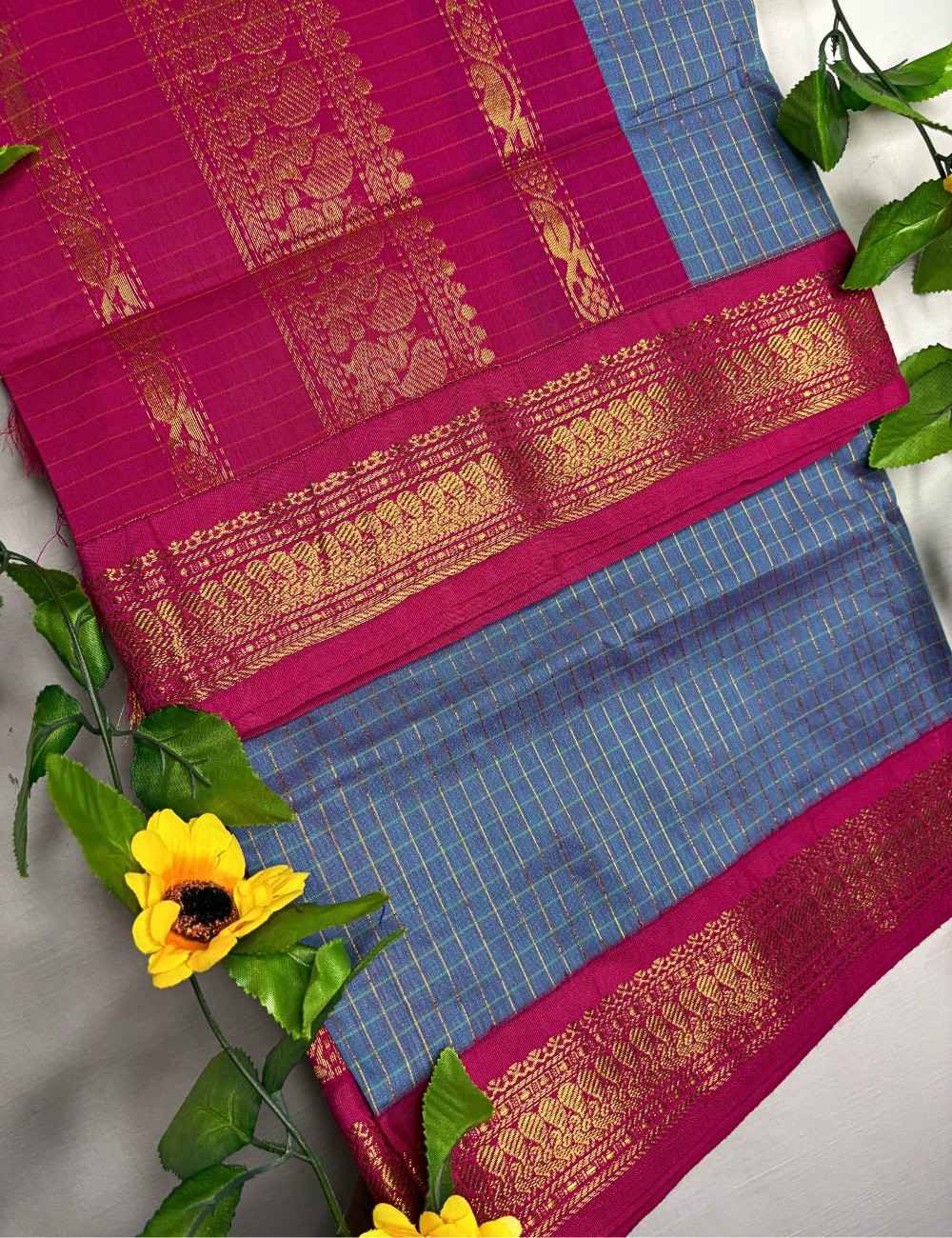 This saree is a regal expression of tradition and elegance. The rich blue body is adorned with intricate golden zari work featuring floral and geometric motifs, while the pallu and borders showcase fine vertical golden stripes and ornate detailing. The deep contrast between the blue base and shimmering gold embellishments creates a timeless festive look.