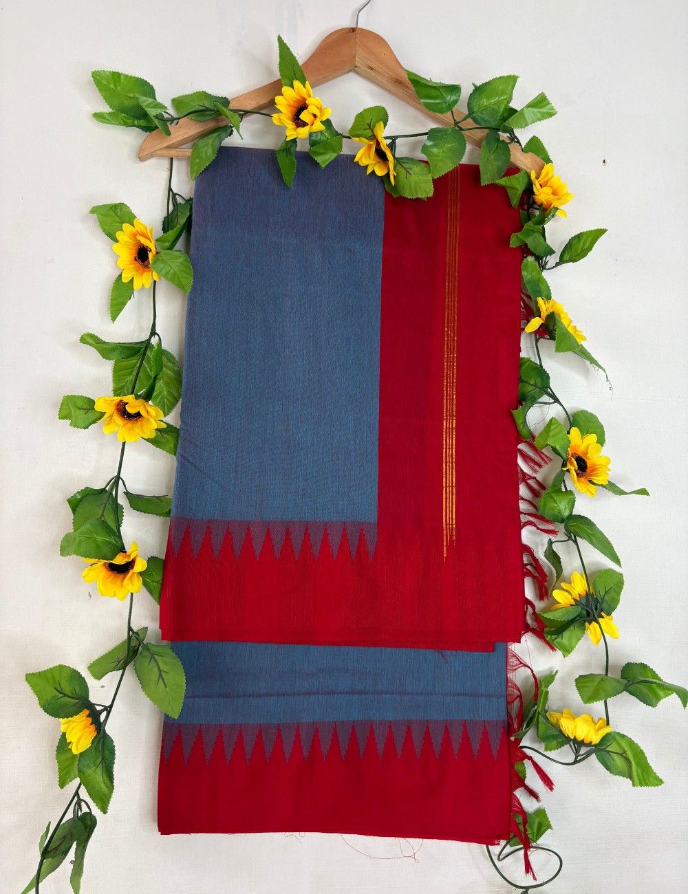 This saree is a graceful blend of vibrancy and heritage. The cool blue body offers freshness and versatility, while the red korvai temple border adds depth and cultural richness. Triangular motifs echo temple gopurams, and golden stripes shimmer across the pallu, creating festive elegance. The contrast between the cool blue and warm red creates a striking visual balance, ideal for both everyday wear and special occasions.