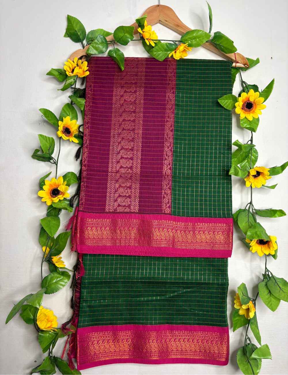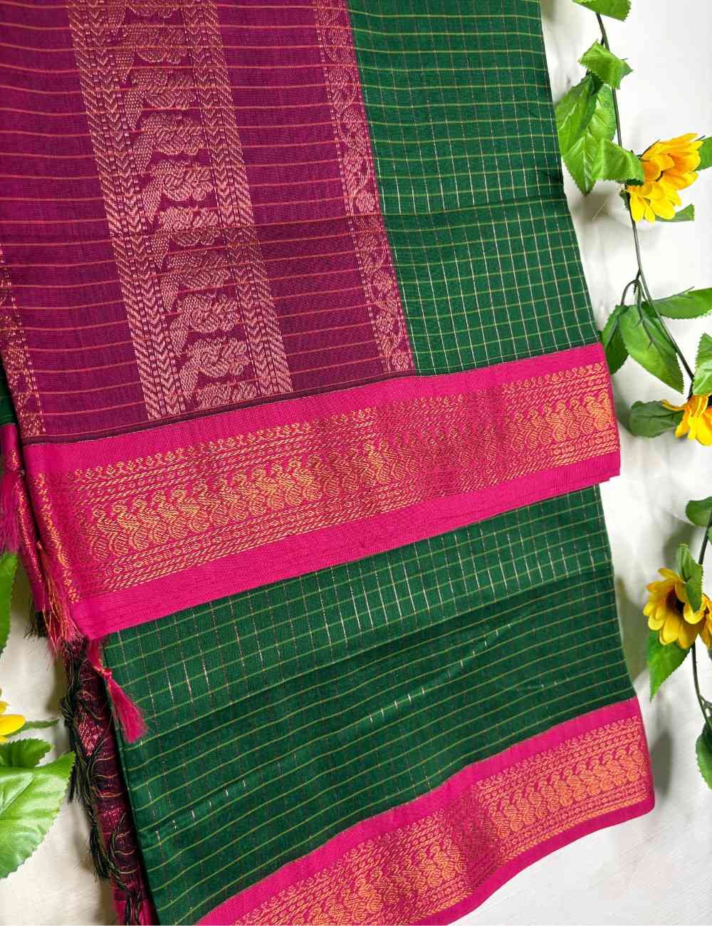 This saree blends richness and tradition with its bottle green body woven in golden checks, creating a luminous grid that feels bold and elegant. The deep pink border is intricately embroidered with golden zari florals and paisleys, adding a vivid contrast that enhances the festive appeal. It’s a saree that feels grand and graceful — perfect for weddings, evening pujas, and cultural celebrations.