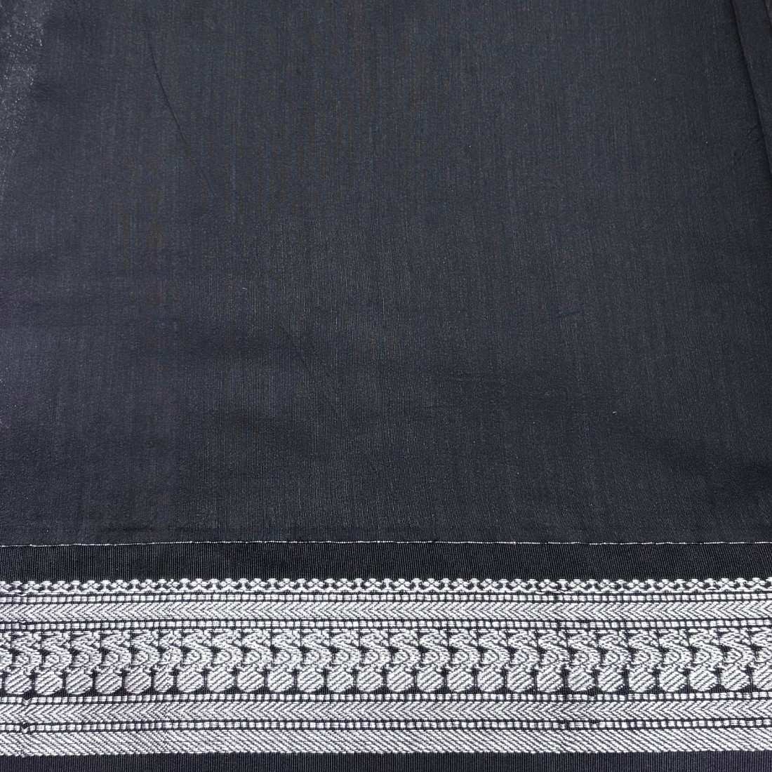 The saree is framed with a striking black contrast border, intricately woven with antique silver zari floral and geometric motifs, giving it a classic South Indian appeal. Finished with traditional tassels on the pallu, this saree blends comfort with timeless charm.