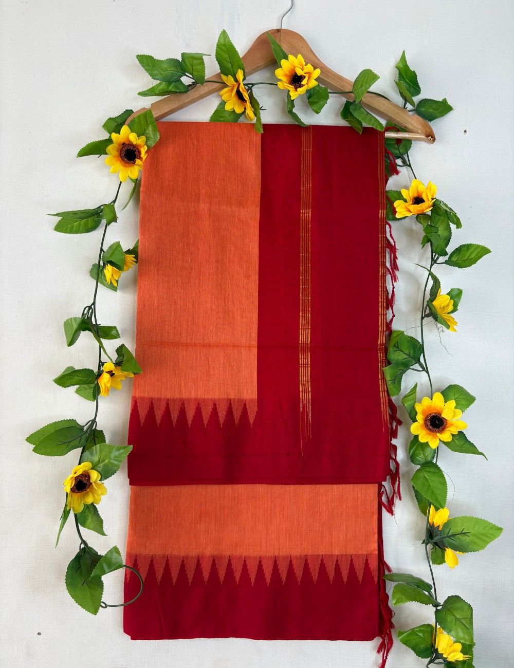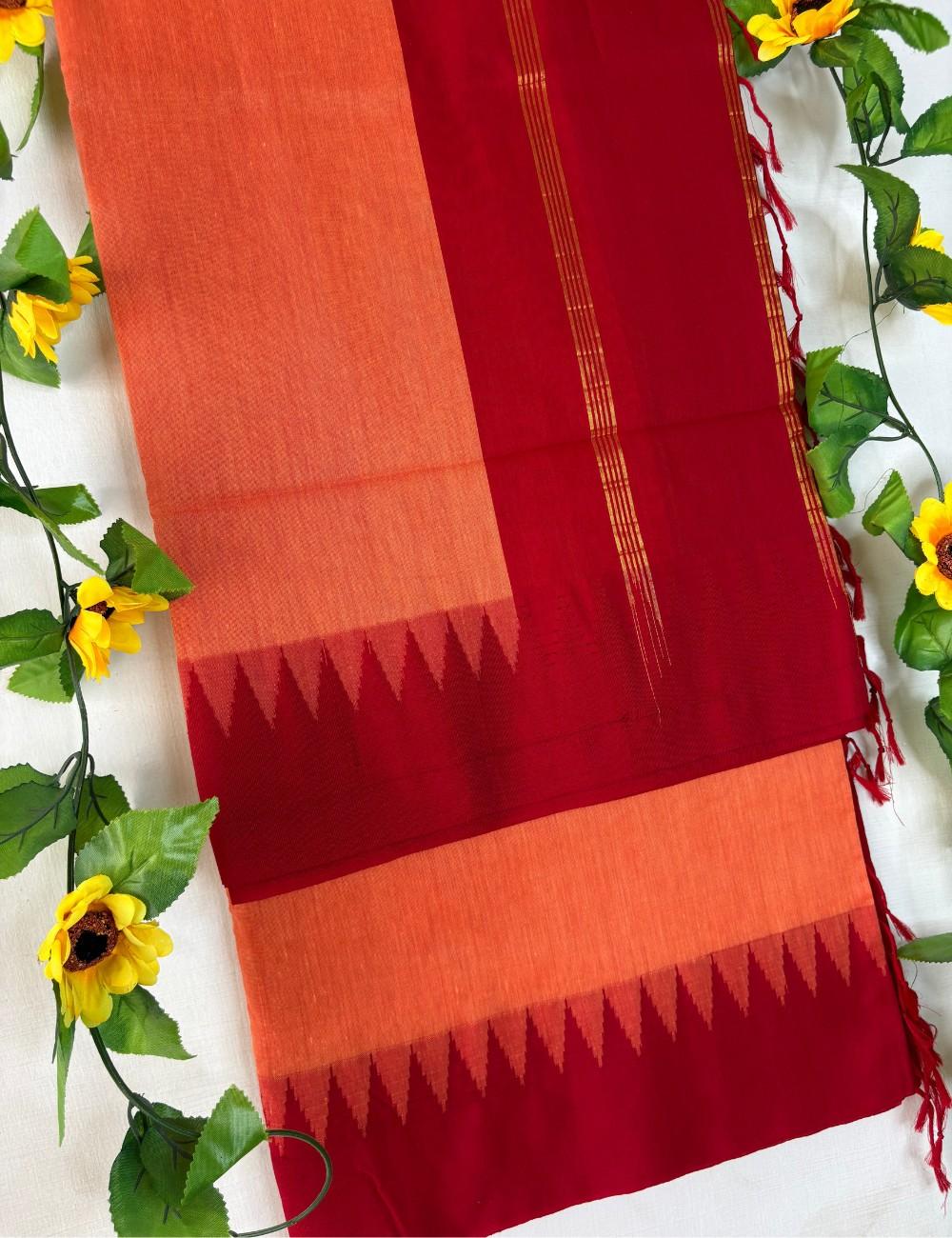 This saree blends earthy warmth with traditional geometry. The burnt orange body offers a deeper, more grounded tone than bright orange, while the red korvai temple border adds cultural rhythm and festive contrast. Triangular zigzag motifs mark the transition between body and pallu, and fine golden stripes shimmer across the red section, enhancing its celebratory appeal. The color pairing evokes autumnal richness and timeless elegance.