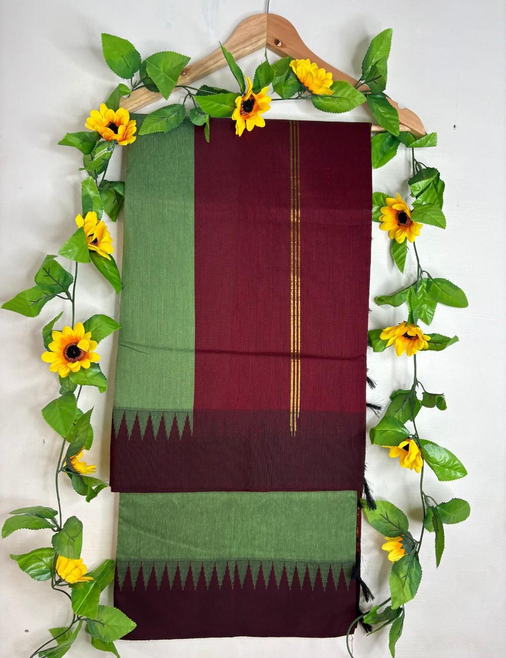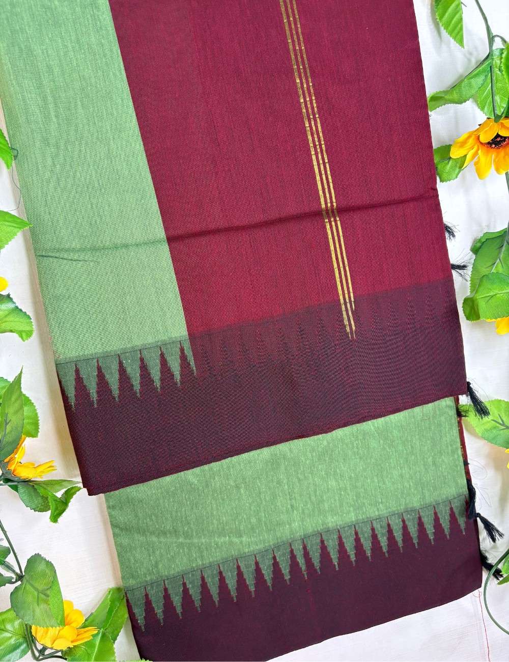This saree blends traditional tones with architectural elegance. The green body offers a balanced, earthy base with subtle texture, while the maroon korvai temple border adds depth and cultural richness. Triangular zigzag motifs mark the transition between body and pallu, and vertical golden stripes shimmer across the maroon section, enhancing its festive appeal.