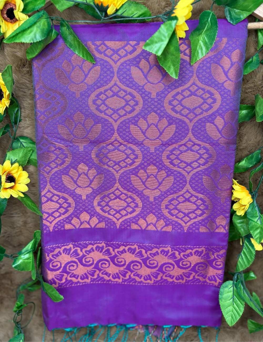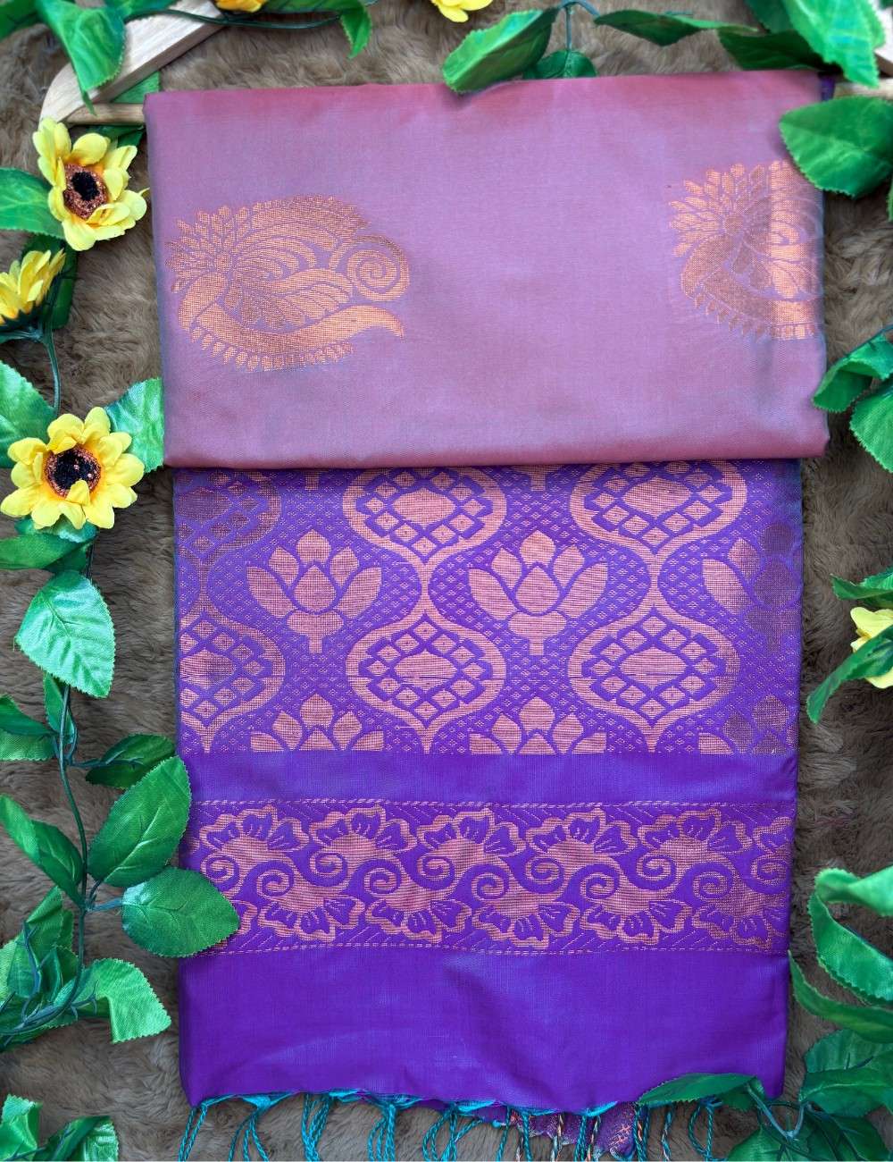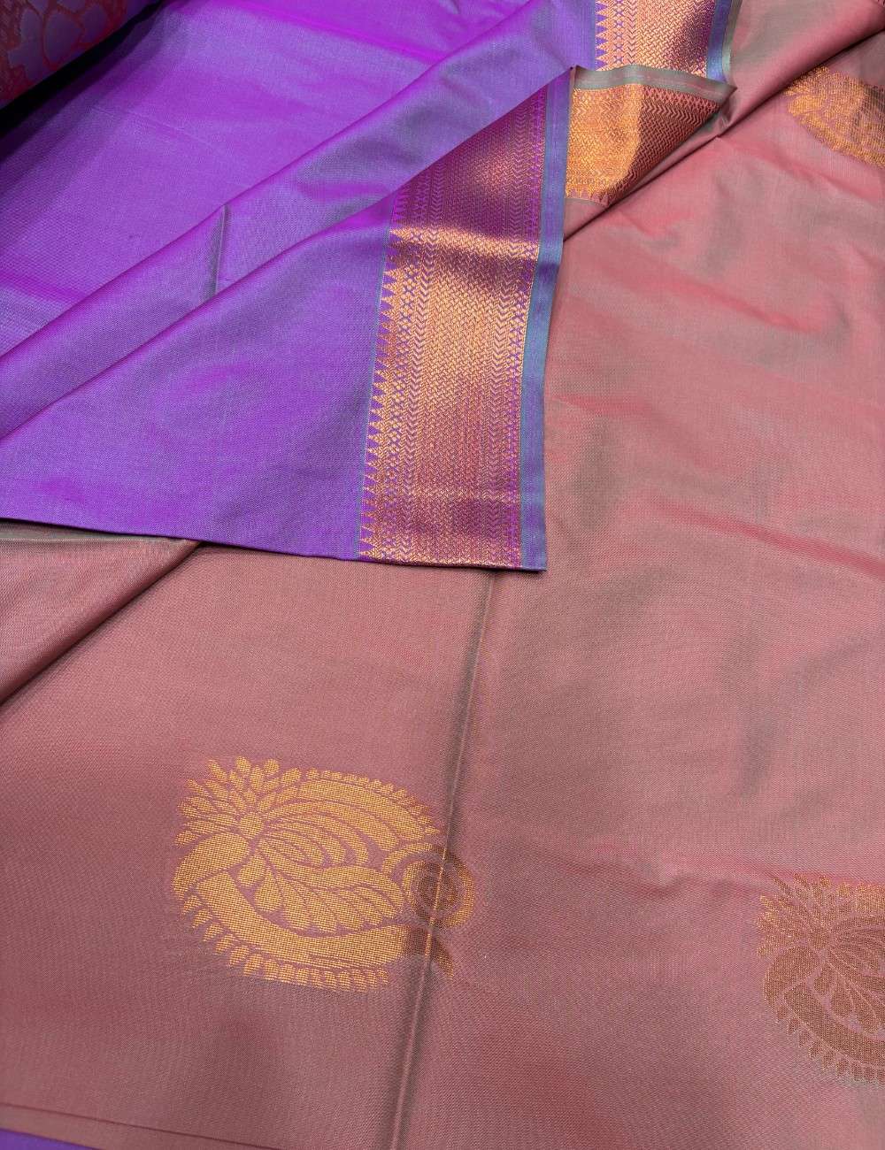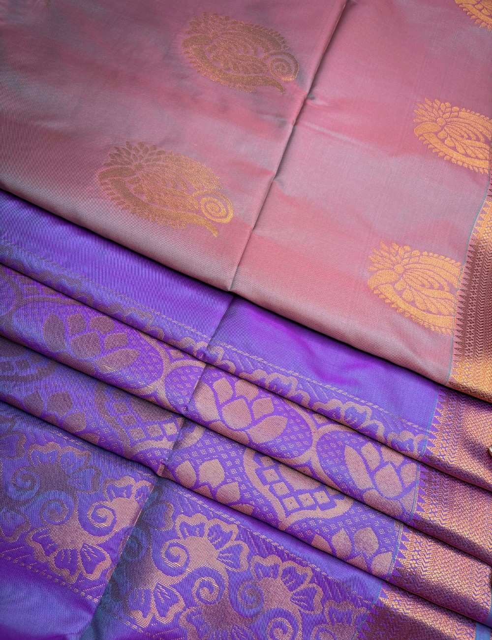 This saree celebrates depth and drama through its double-toned body — where copper warmth meets violet richness in a seamless gradient. Golden paisley motifs adorn the upper copper section, while the violet lower half blooms with intricate floral and geometric zari work, adding movement and grandeur.