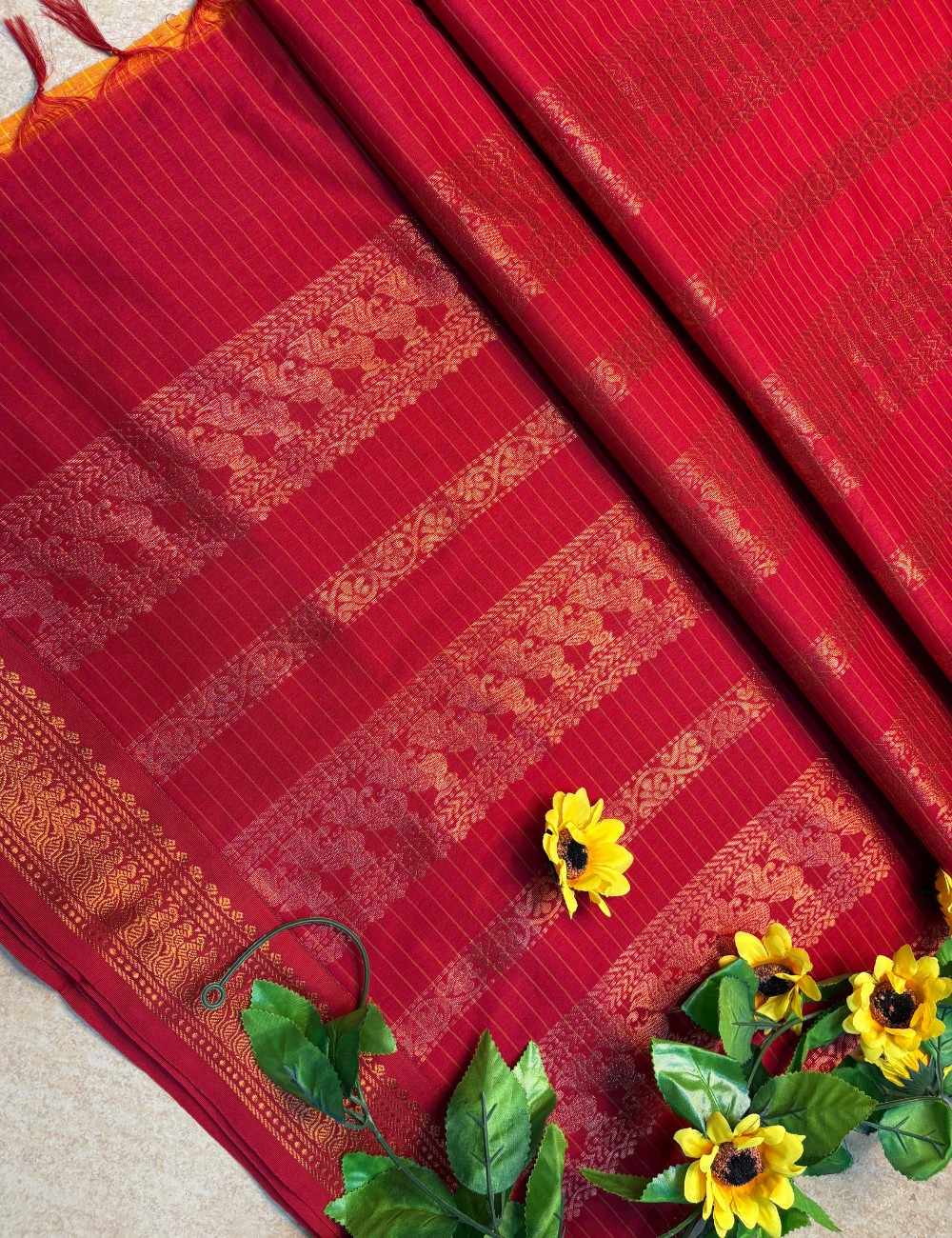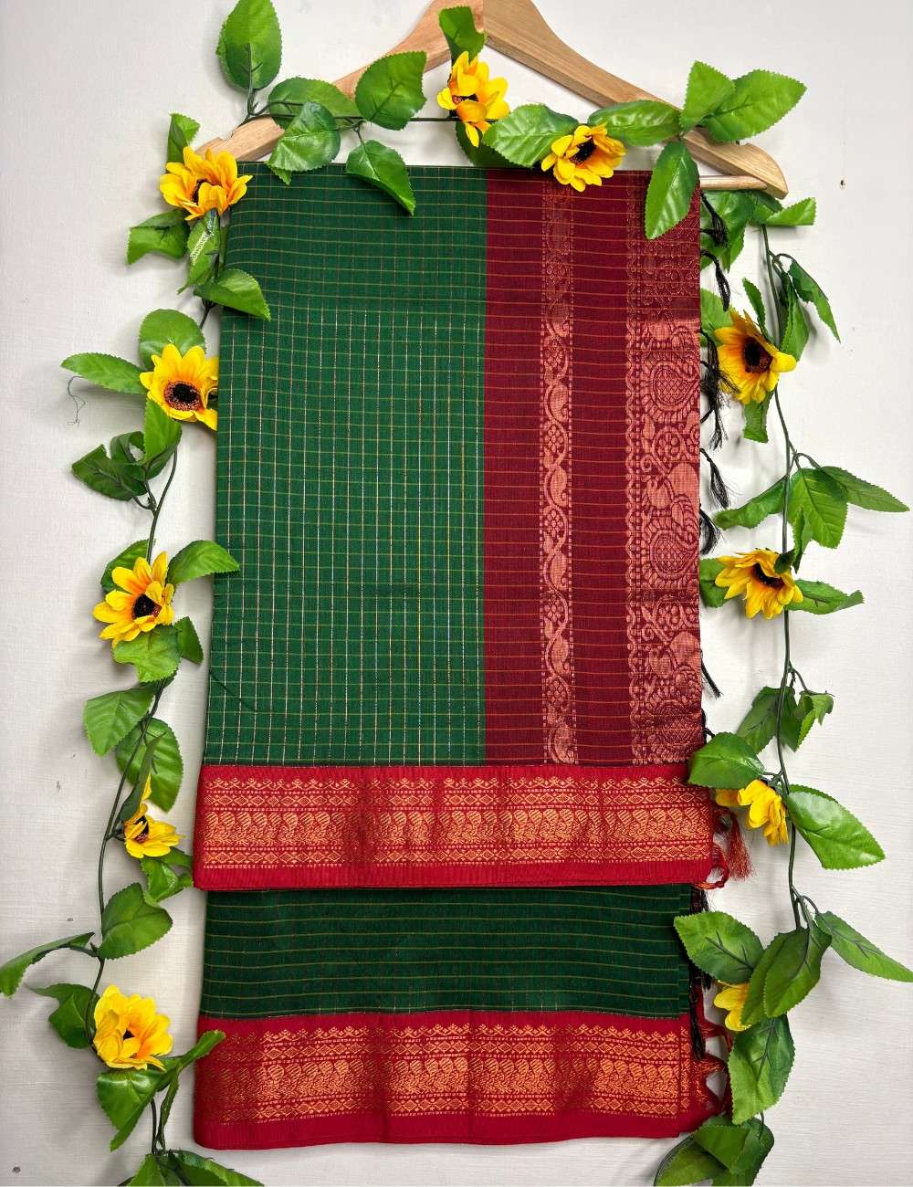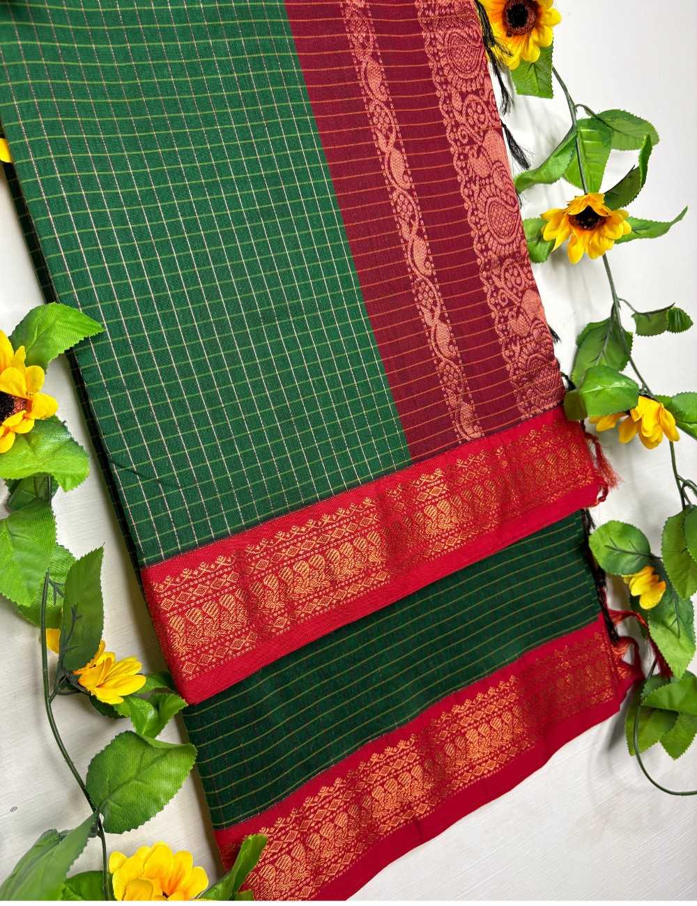 This saree features a rich deep green body woven in classic checks, paired with a vibrant red border adorned with intricate golden zari motifs. The bold contrast of green and red evokes festive grandeur, making it a perfect choice for temple visits, weddings, and cultural celebrations.