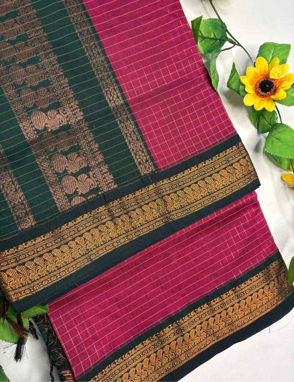 A deep pink checks Kalyani cotton saree paired with bottle green blouse. Copper zari border adds vibrant elegance. Paired with a matching bottle green blouse, this ensemble is perfect for women who love expressive tones elevated by traditional craftsmanship.