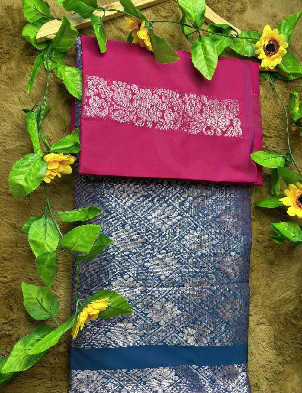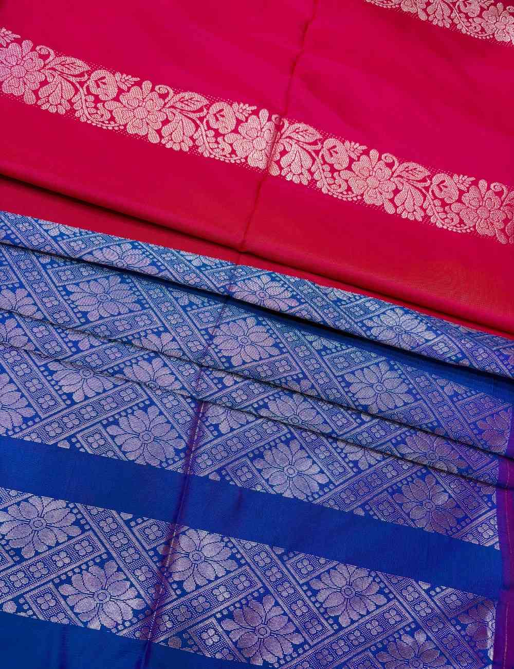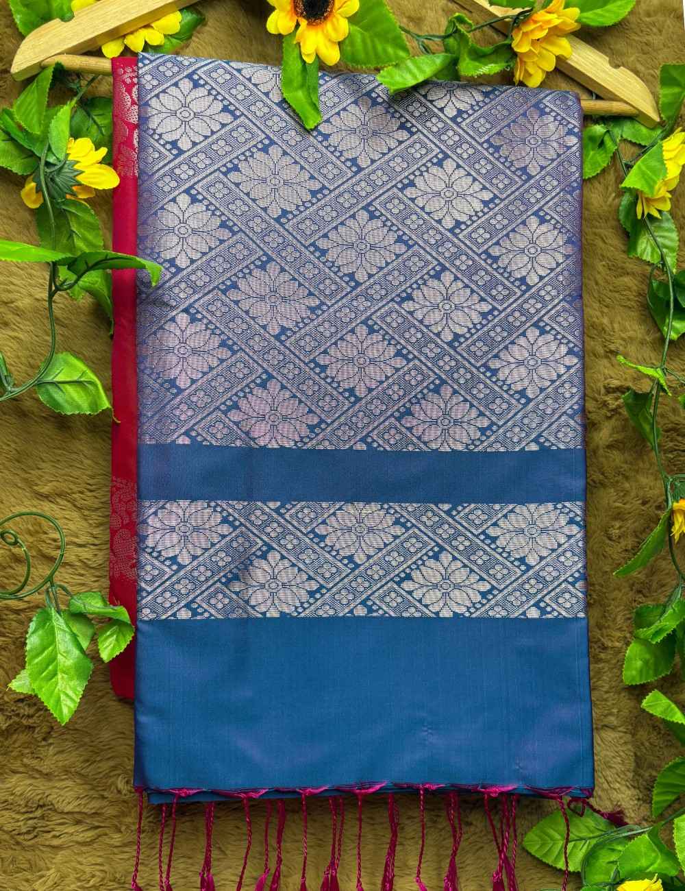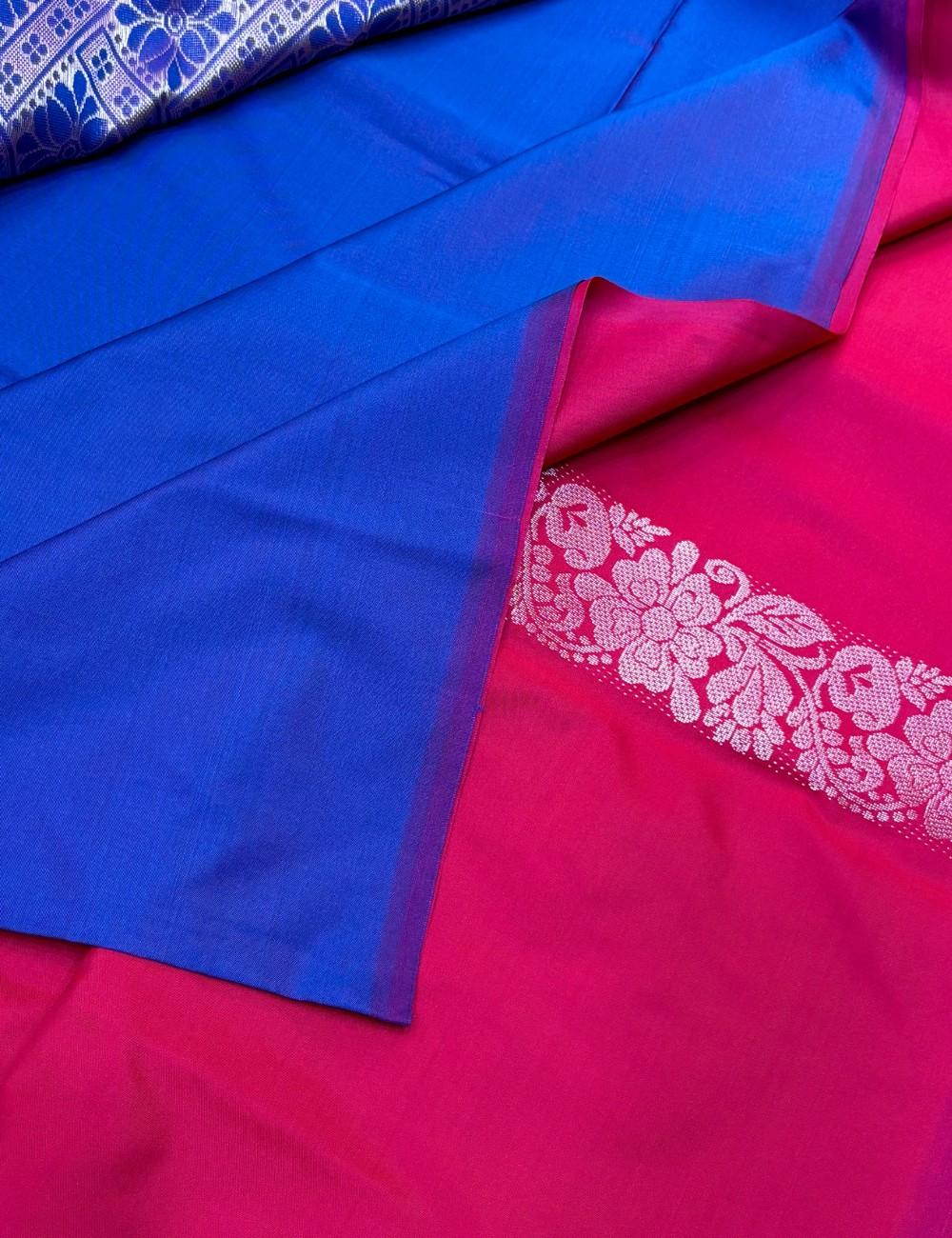 The blue pallu peeking beneath the fold offers a bold contrast, enhanced by magenta tassels that add movement and flair. Ideal for festive mornings, haldi functions, or cultural events, this Raga soft silk saree is a graceful blend of softness and statement.
