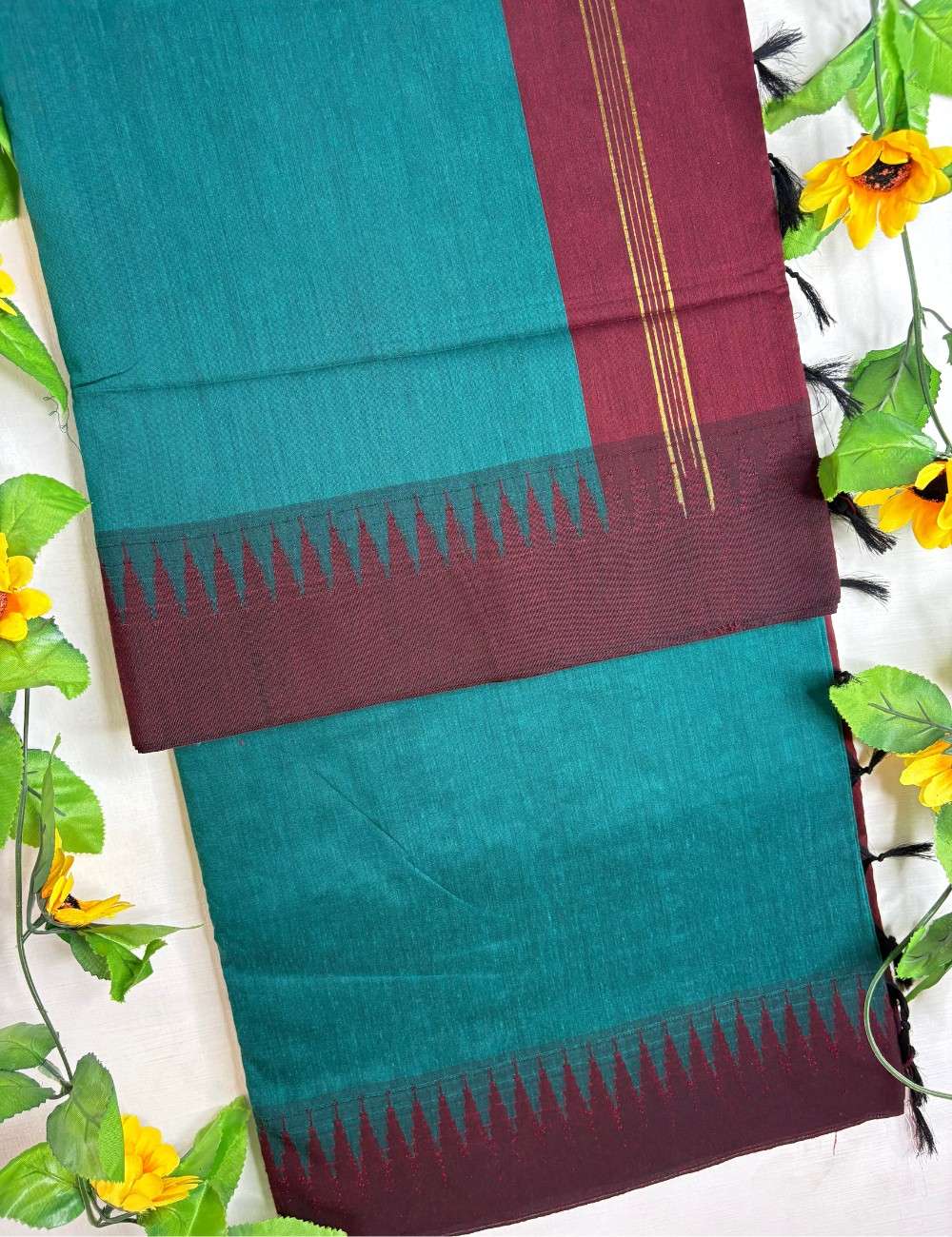This saree blends jewel tones with traditional geometry. The deep teal body offers a bold, elegant base, while the maroon korvai temple border adds depth and cultural richness. Triangular zigzag motifs along the border echo temple gopurams, and vertical golden stripes shimmer across the maroon section, enhancing its festive appeal.