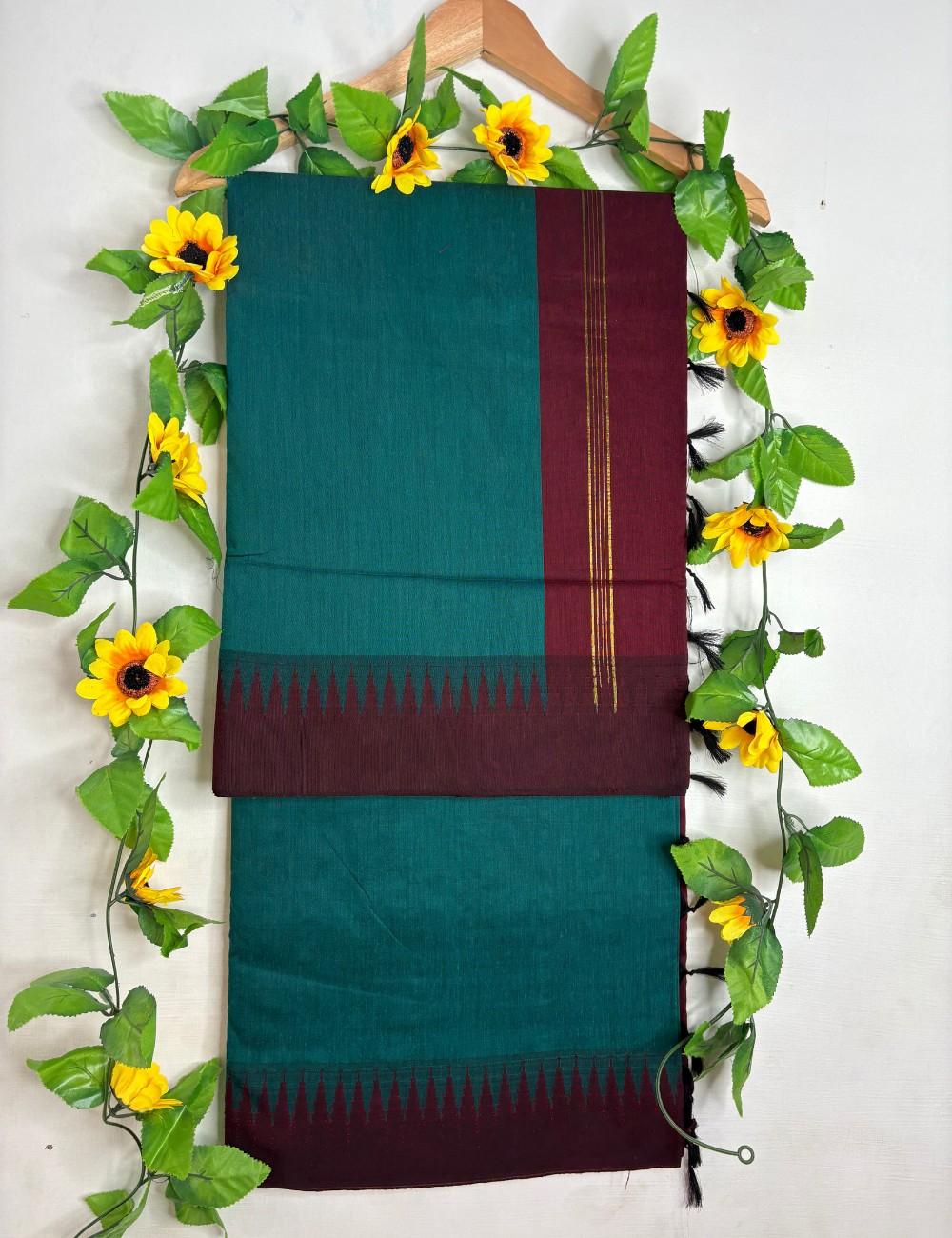 A deep teal body paired with maroon temple border. Zigzag motifs and golden stripes add festive shimmer and architectural rhythm. This saree is ideal for women who appreciate rich tones, handcrafted detail, and timeless South Indian textile artistry.