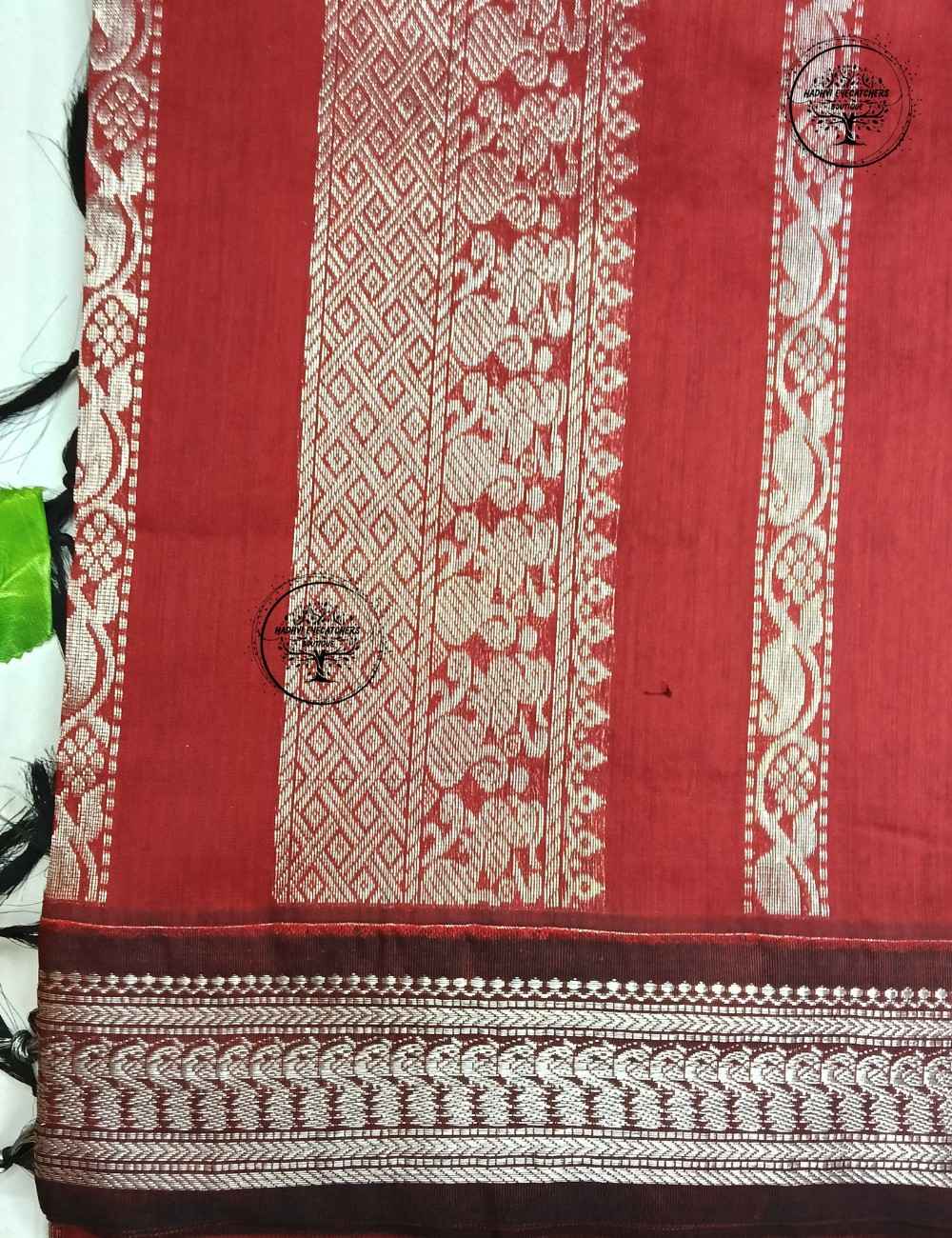 This deep wine red Kalyani cotton saree is a classic choice for lovers of understated elegance. The rich red body has a smooth cotton texture adorned with delicate silver zari buttas that add a subtle shimmer without overpowering the look. The saree is finished with a beautifully woven silver zari border featuring traditional floral and geometric patterns, lending it a timeless South Indian appeal.
