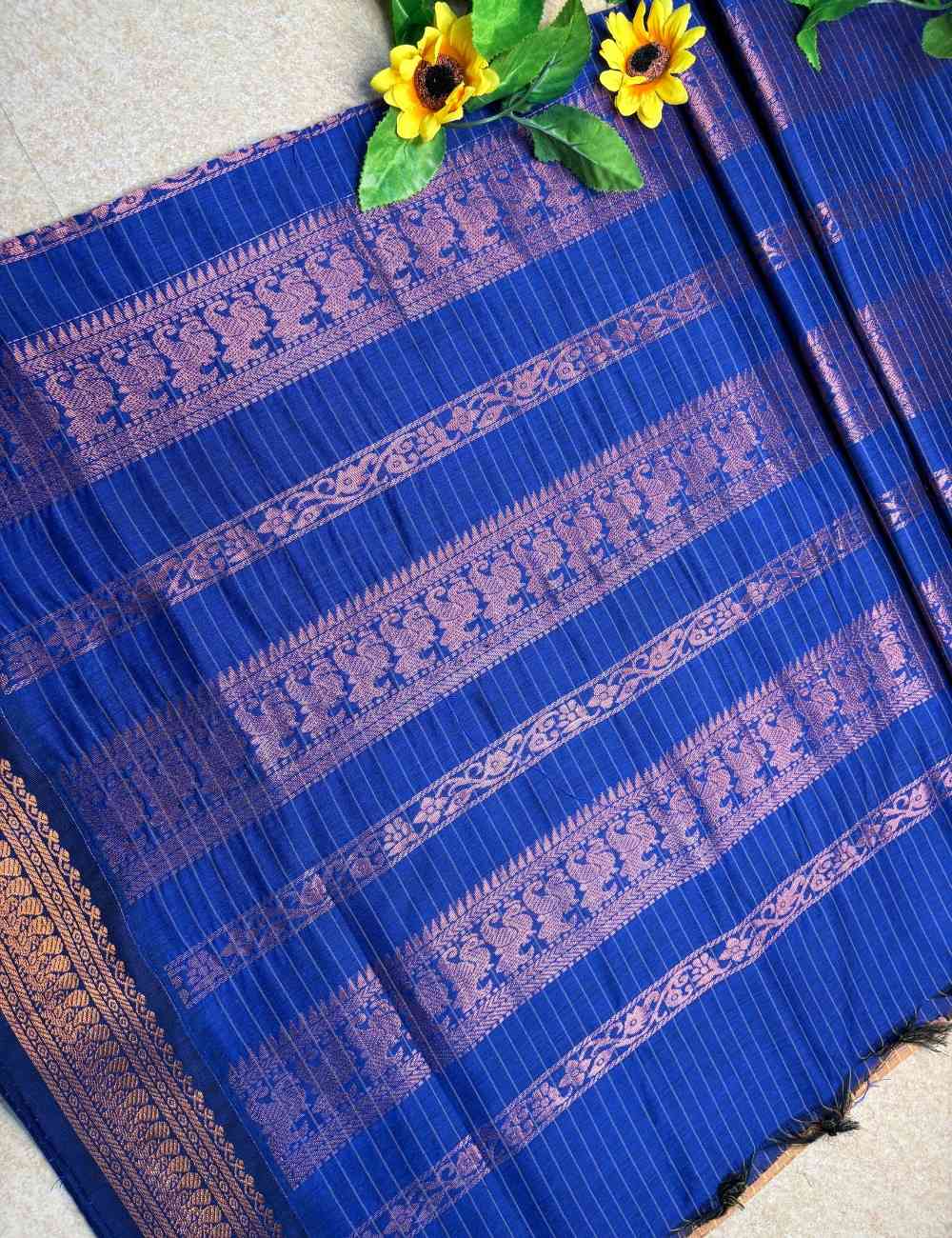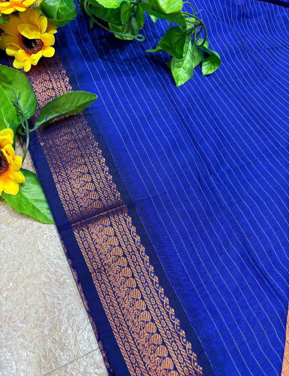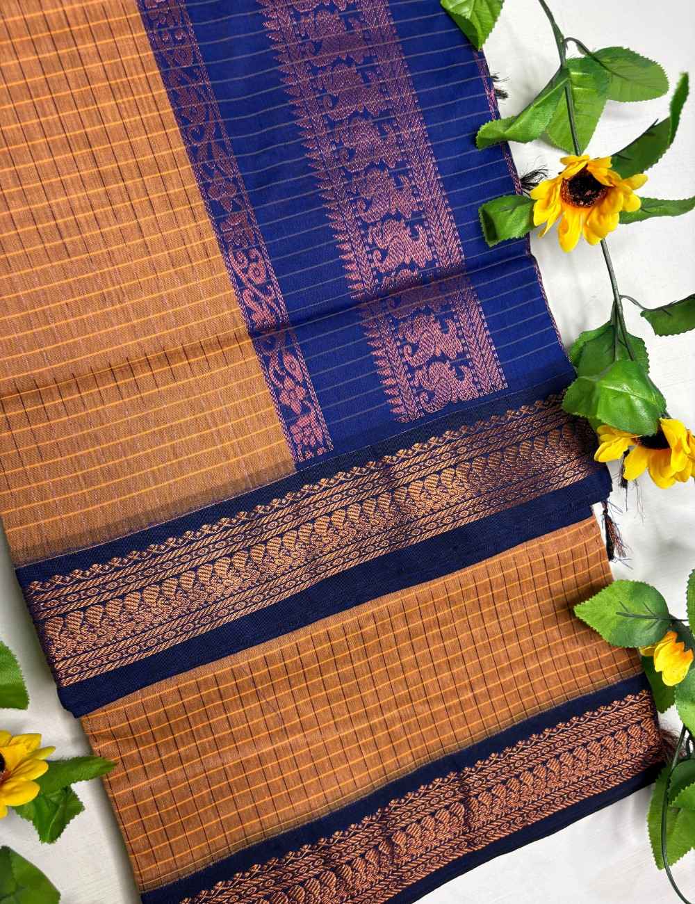 This saree blends earthy richness with regal contrast. The golden brown body features a copper-toned checkered weave in classic Checks Raga Kalyani cotton, while the royal blue border and pallu are adorned with copper zari motifs — florals and paisleys that evoke temple artistry. The warm brown paired with deep blue creates a grounded yet celebratory palette ideal for cultural gatherings and festive occasions.