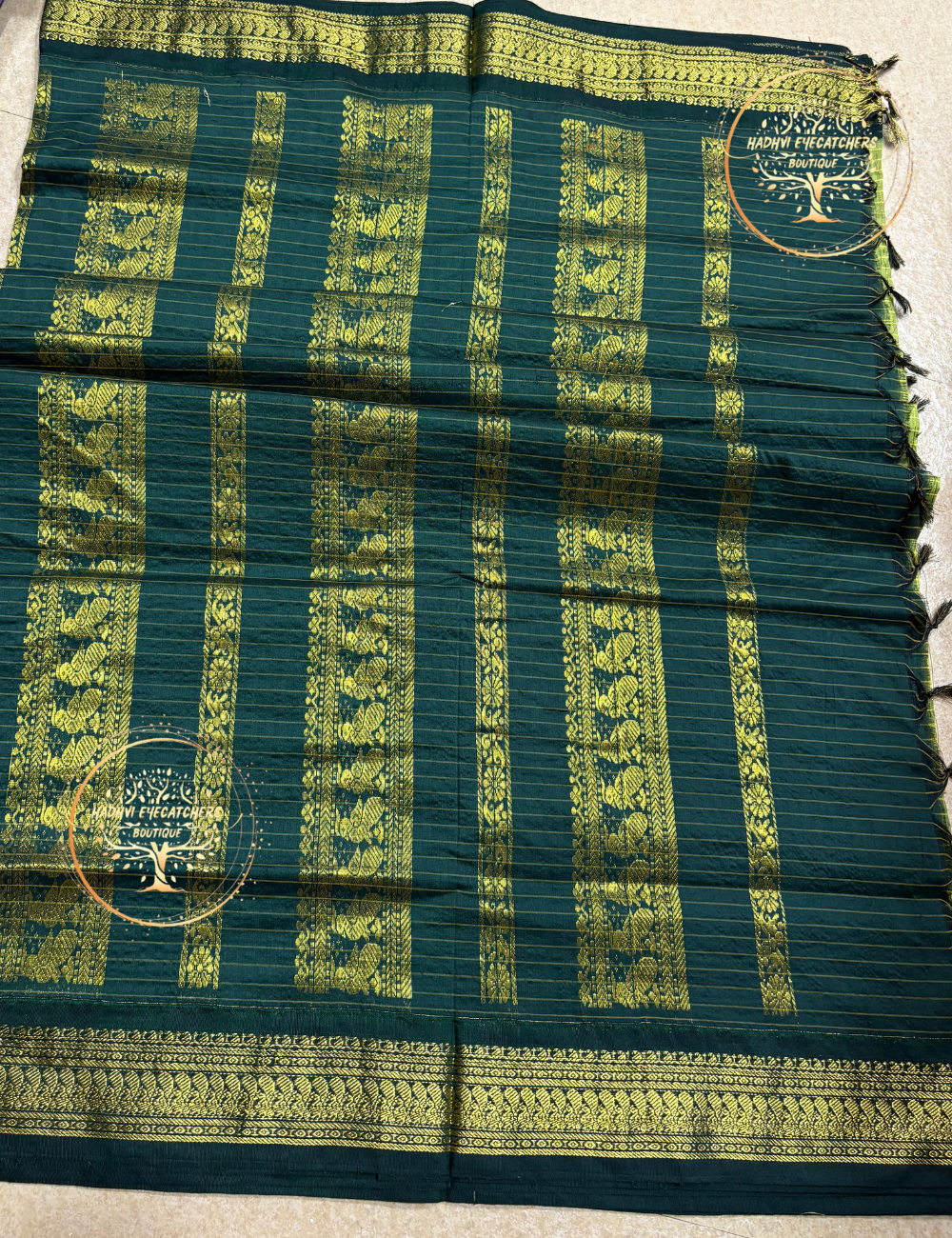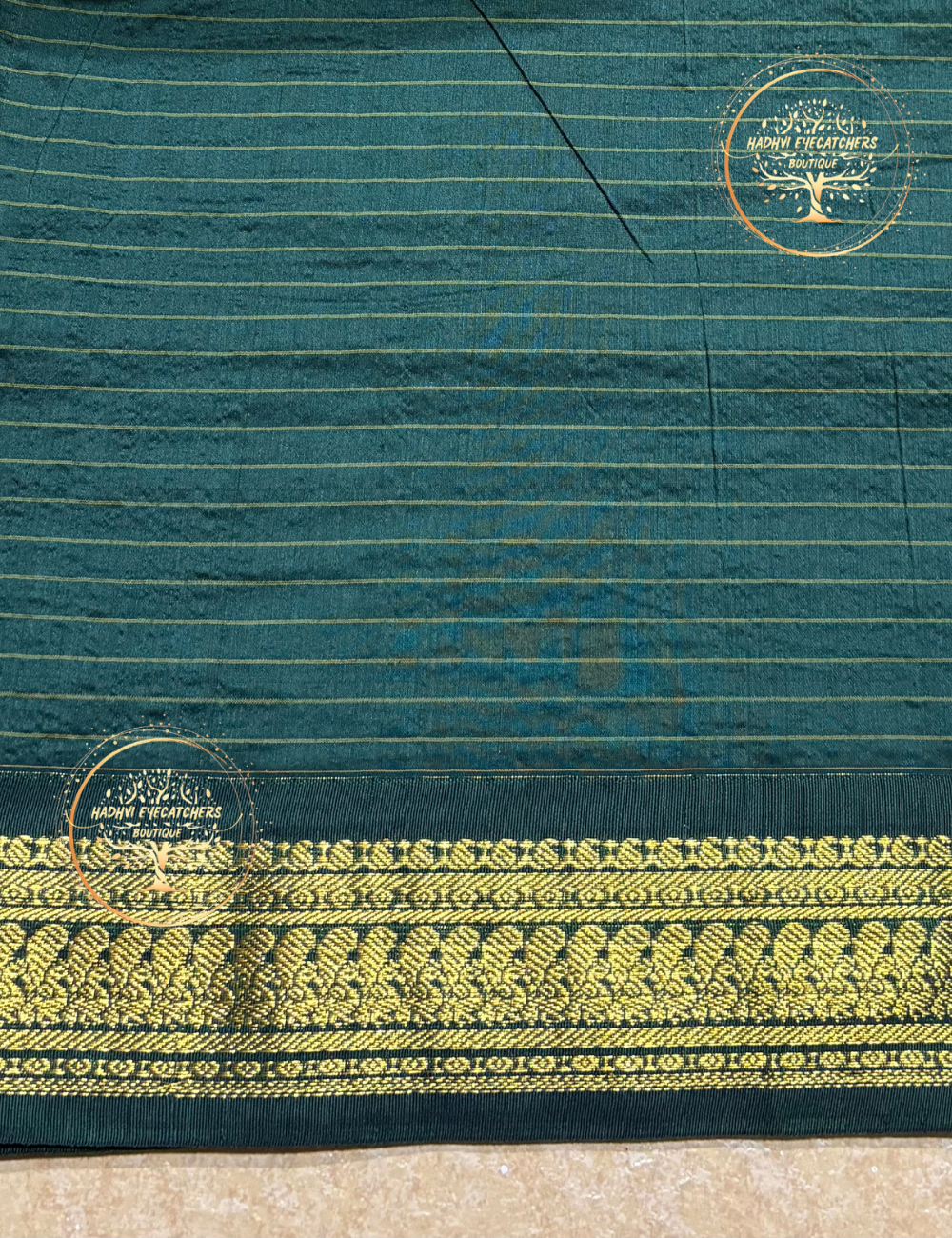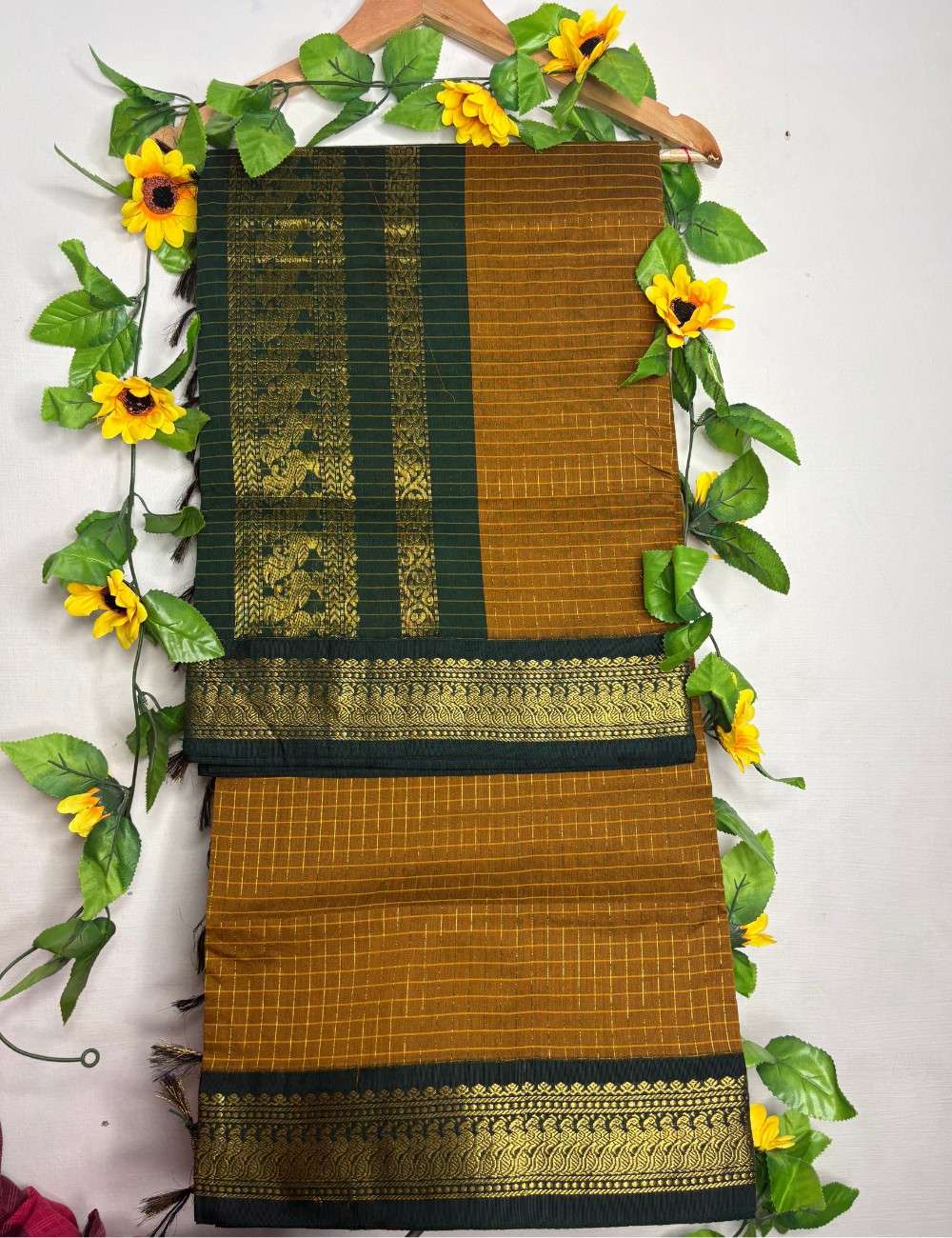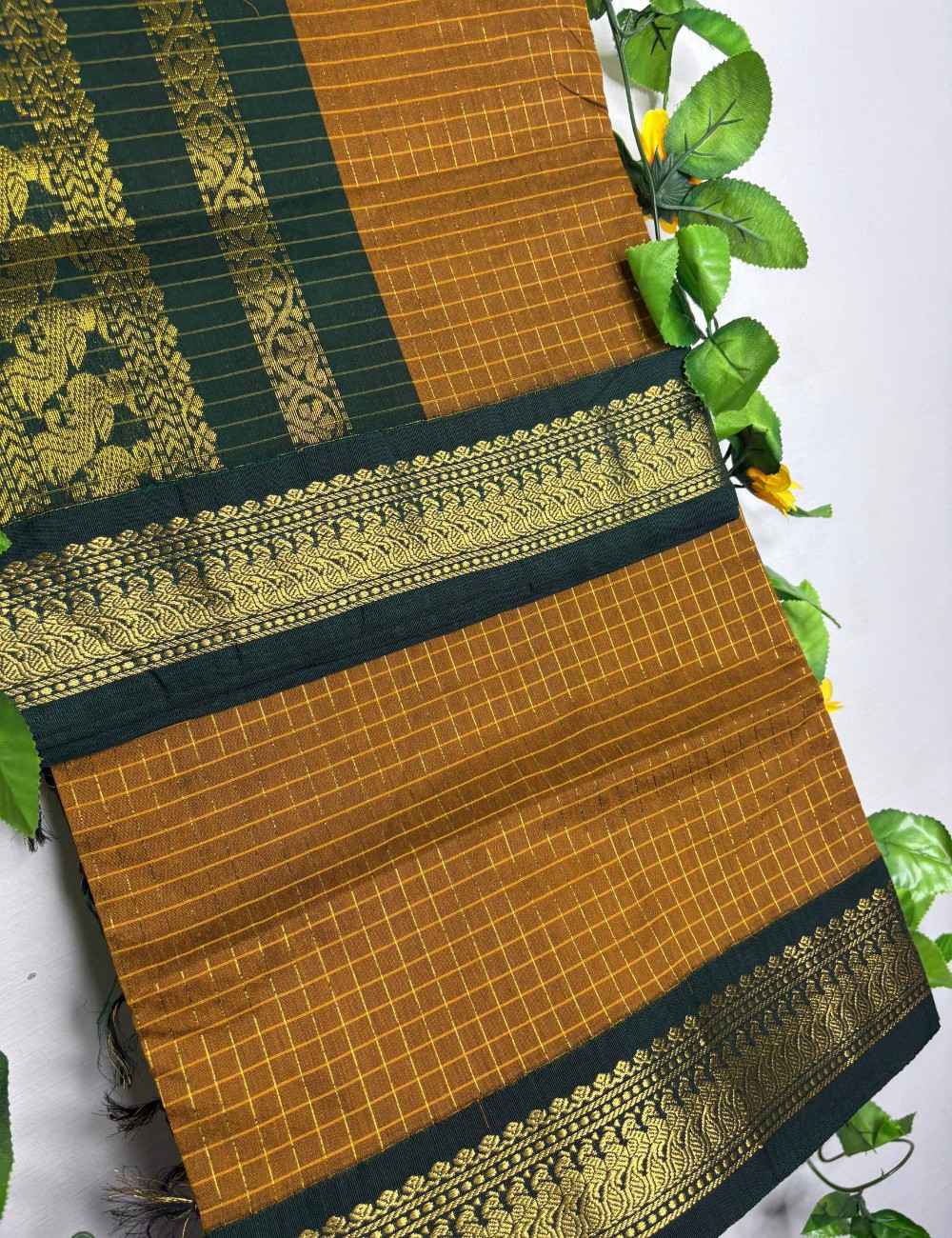 This saree blends earthy elegance with festive richness. The golden mustard body is patterned with fine yellow grid lines, creating a subtle texture that complements its warm tone. The dark green borders and pallu are intricately woven with golden floral and paisley motifs, adding depth and traditional charm.