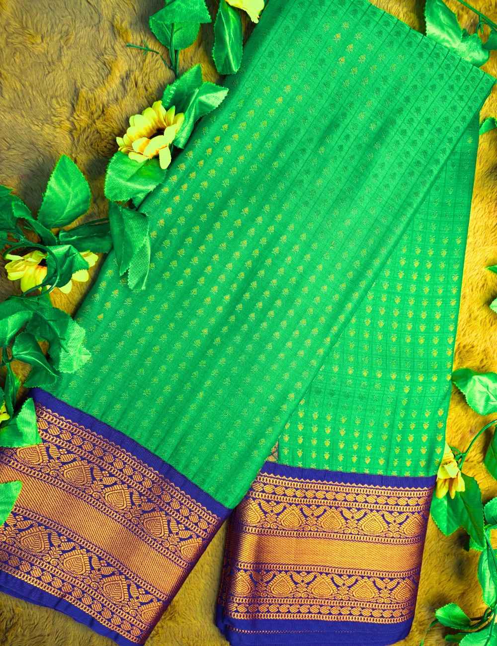 This Lakshadeepam saree showcases a lush green body filled with golden buttas arranged in a grid pattern. The Semi Kanchi Silk weave adds depth and brilliance, making the motifs shimmer with elegance.