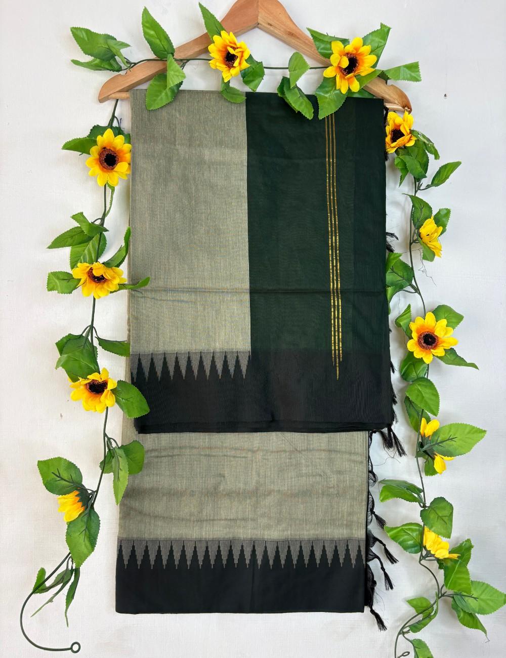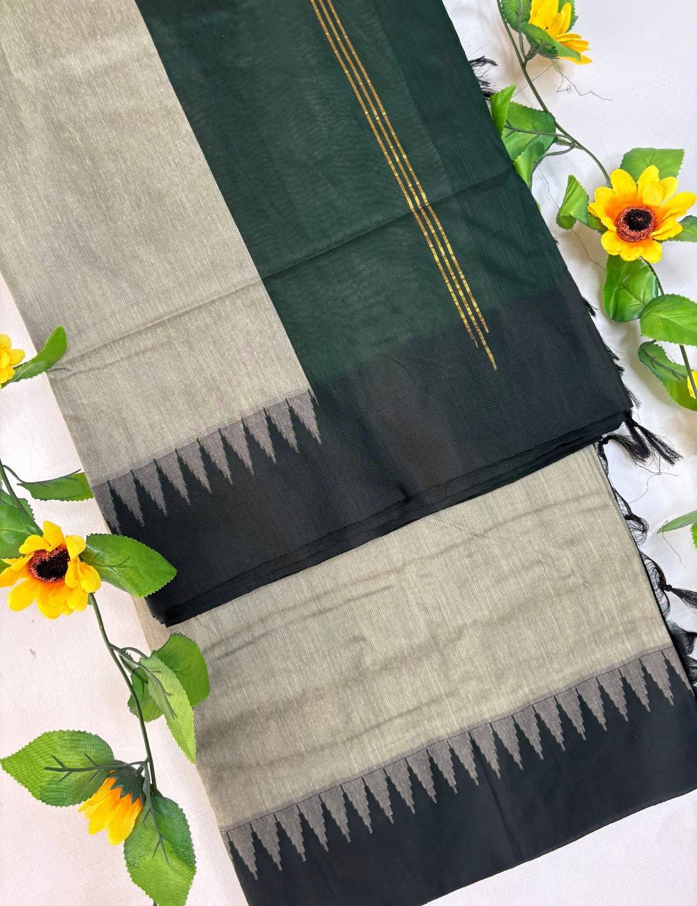 A rich green body meets a soft beige pallu in this Raga Kalyani cotton saree. The triangular temple border and chit pallu add cultural depth, while golden stripes bring subtle elegance. Lightweight and breathable, it’s perfect for office and casual wear. Style it with antique gold or natural-finish jewelry to highlight its earthy palette. A thoughtful choice for women who value tradition, versatility, and sustainability — perfect for office and casual wear.