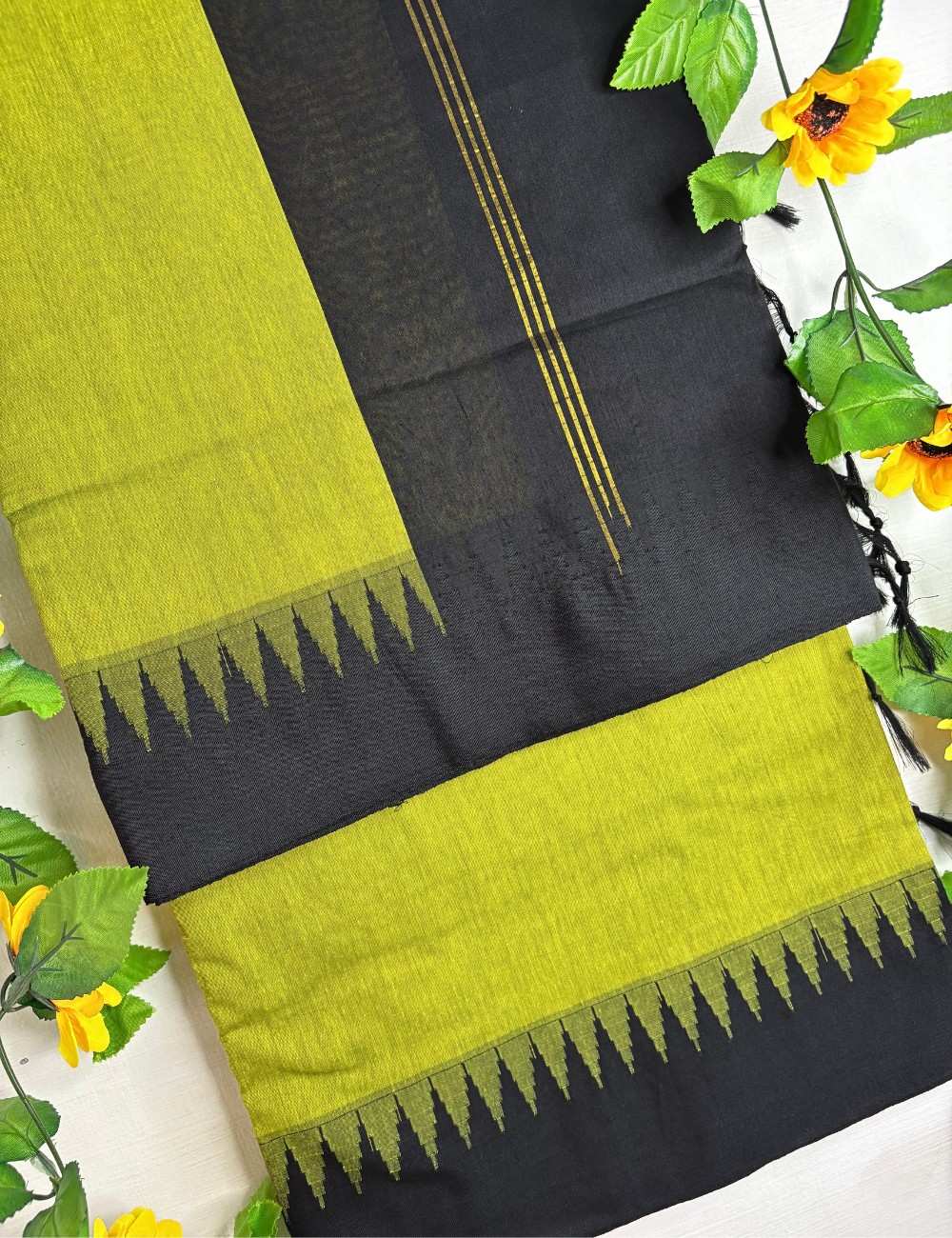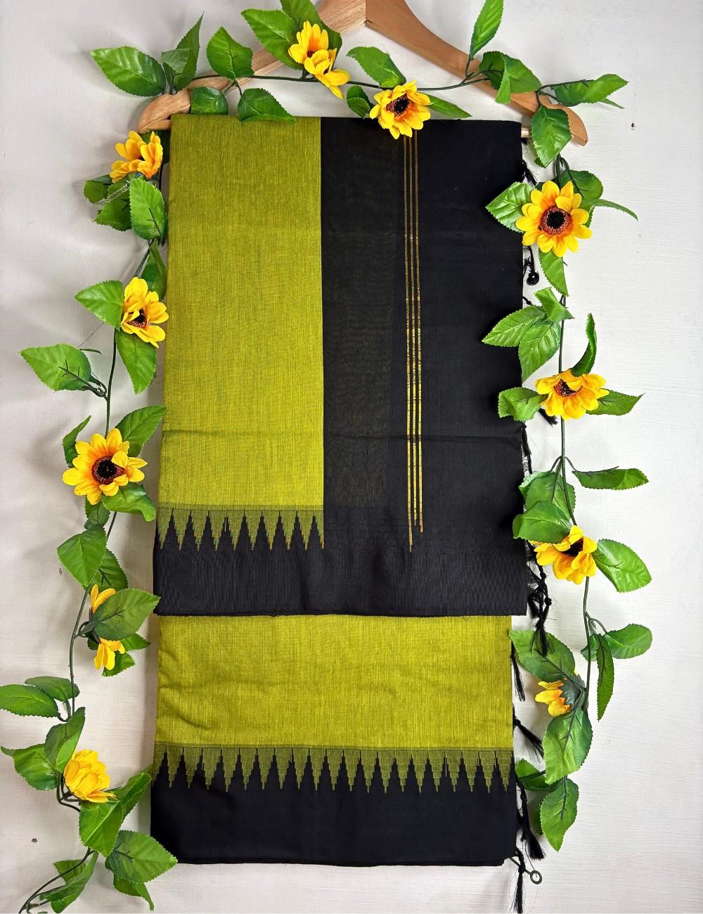 A vibrant green pallu meets a deep black body in this Raga Kalyani cotton saree, creating a fresh, eye-catching contrast. The jagged korvai temple border in black triangles and fine vertical golden lines on the black section add heritage detail and subtle shimmer. Breathable and lightweight, it’s ideal for office days, festive mornings, and casual celebrations.