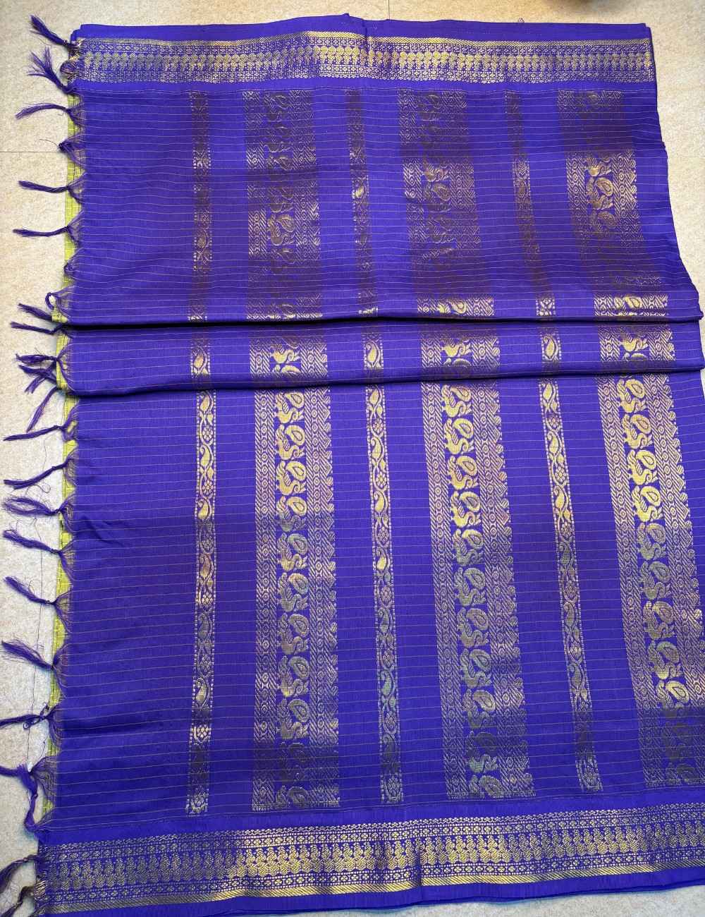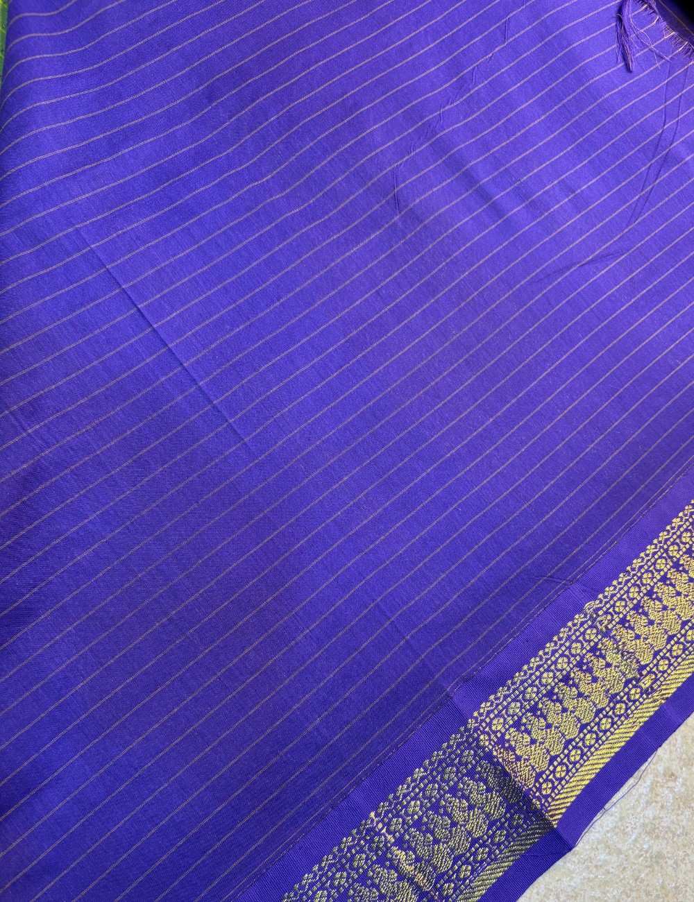 This saree blends lush vibrancy with traditional grace. The green body features a golden checkered pattern, while the purple border is adorned with intricate floral and paisley zari motifs. The Navy Blue blouse complements the ornate border, creating a rich palette ideal for weddings, festivals, and cultural events.