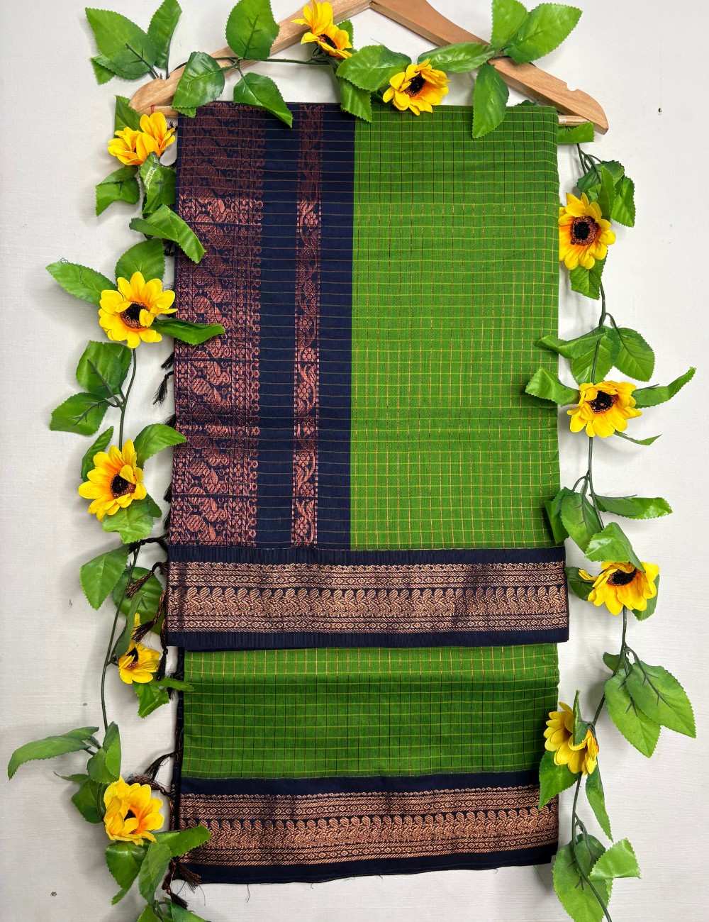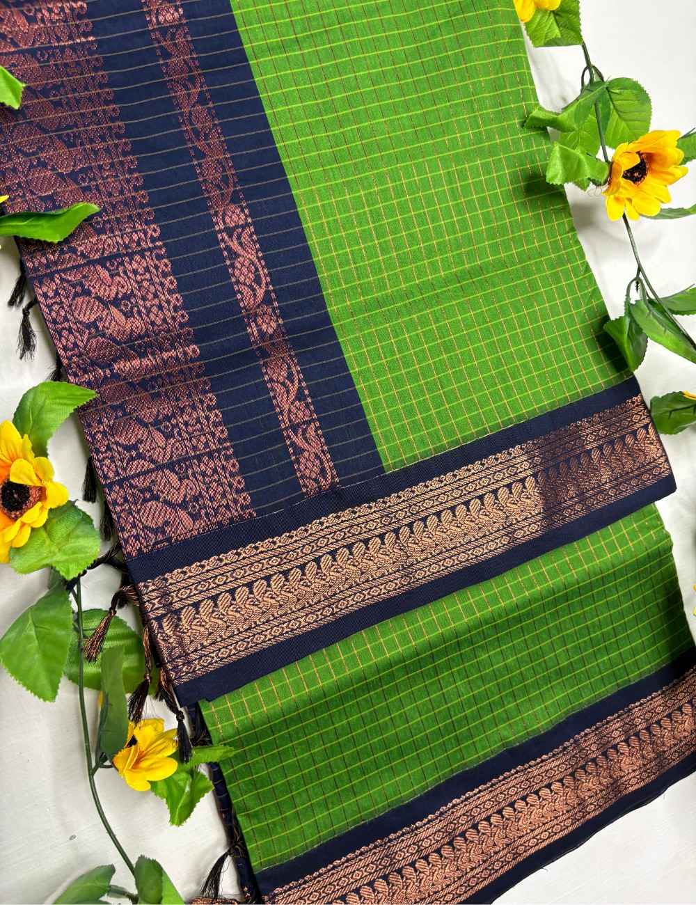 This saree blends earthy vibrance with regal sophistication. The green body features a subtle checkered weave highlighted with fine red and yellow lines, capturing the essence of Checks Kalyani cotton. The navy blue border and pallu are richly adorned with golden zari motifs — florals and paisleys that evoke temple artistry and festive grandeur. The contrast between the green body and navy border creates a striking palette ideal for weddings, cultural events, and joyful celebrations.