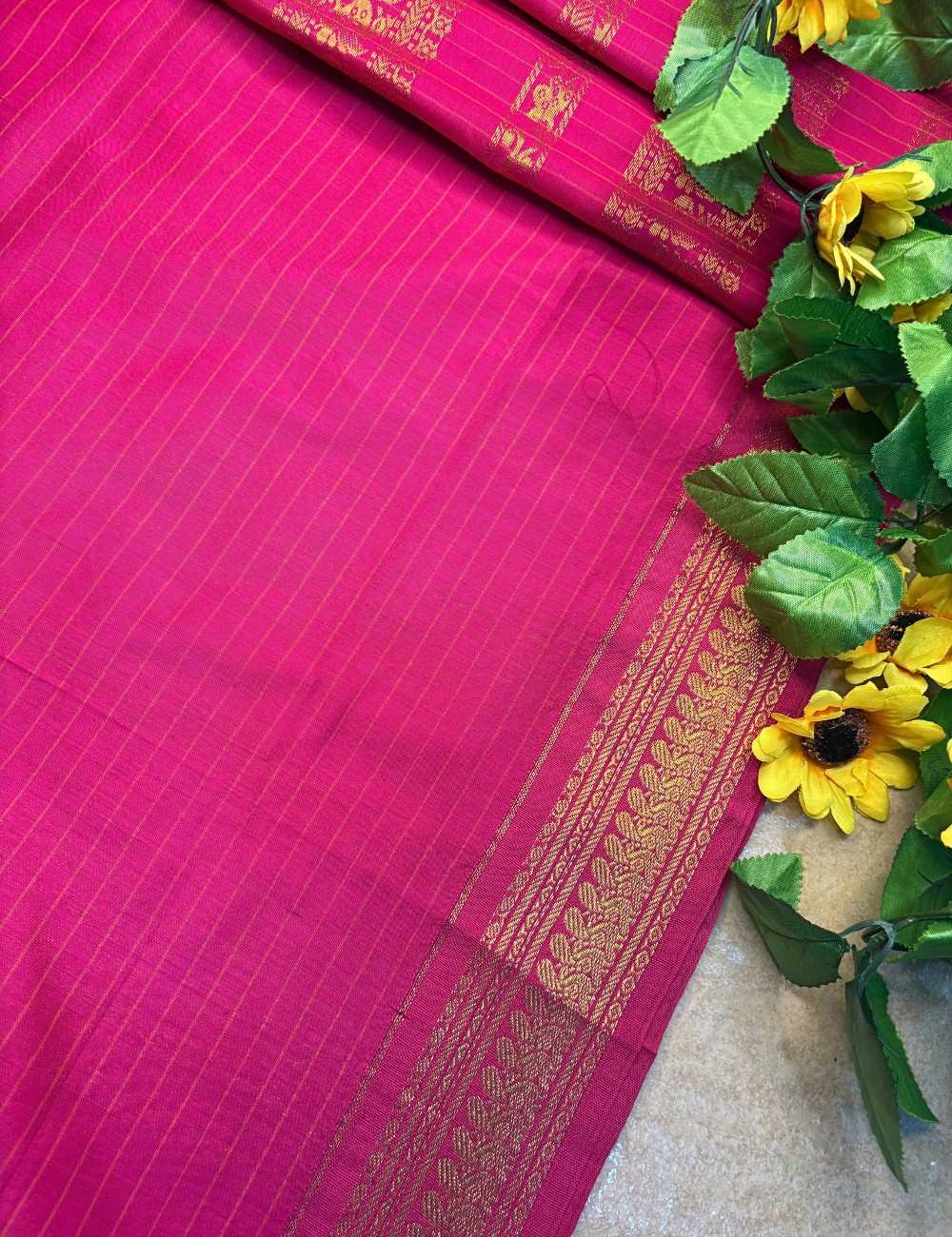 Handloom woven in pure acrylic Kalyani cotton, the fabric is breathable, lightweight, and easy to drape, ensuring comfort throughout long celebrations. The golden zari detailing adds a touch of shimmer, making it ideal for weddings, temple visits, and cultural gatherings. This saree pairs beautifully with gold jewelry, statement bangles, or even a contrasting blouse for a bold, contemporary twist. Its versatile design allows it to shine equally in daytime rituals and evening festivities, making it a wardrobe essential for those who value tradition with a modern edge.