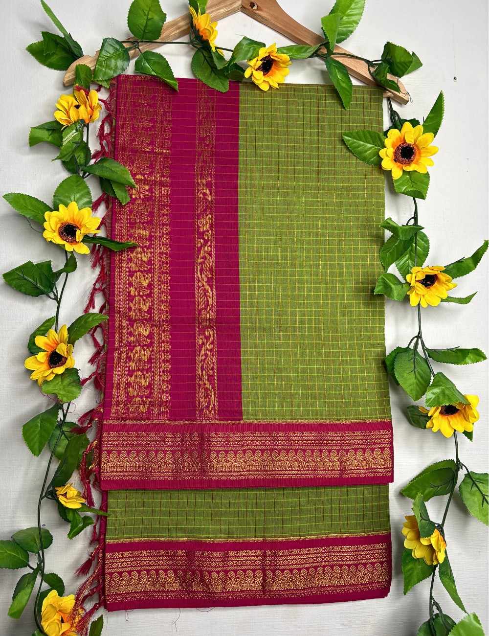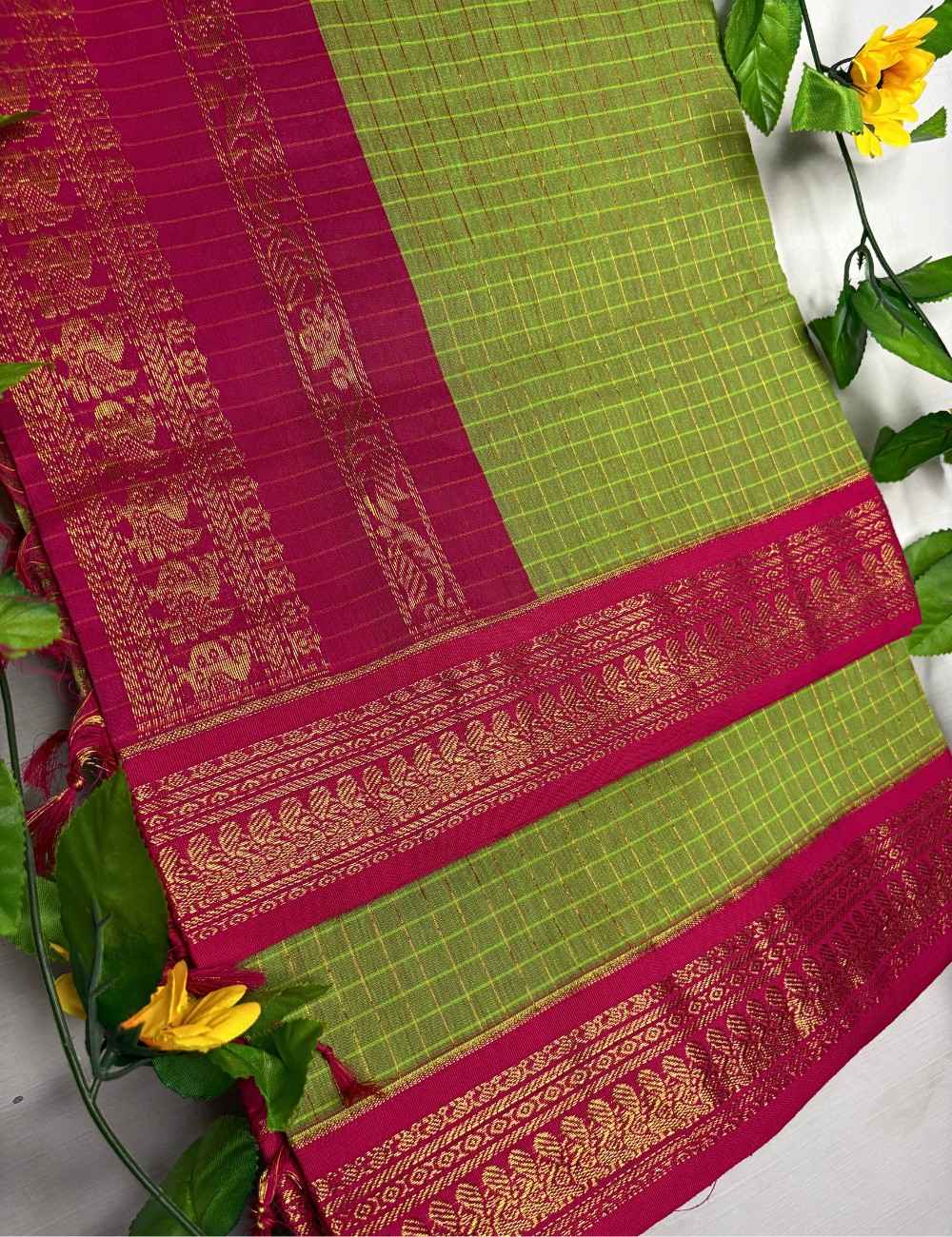 Step into festive elegance with this striking handloom saree. The body is woven in a refreshing green shade, detailed with fine yellow grid checks that add subtle texture and depth. Its contrasting bright pink borders and pallu create a vibrant highlight, richly adorned with golden zari motifs inspired by traditional floral and paisley artistry. The interplay of earthy green and radiant pink makes this saree a perfect blend of heritage and modern vibrancy.