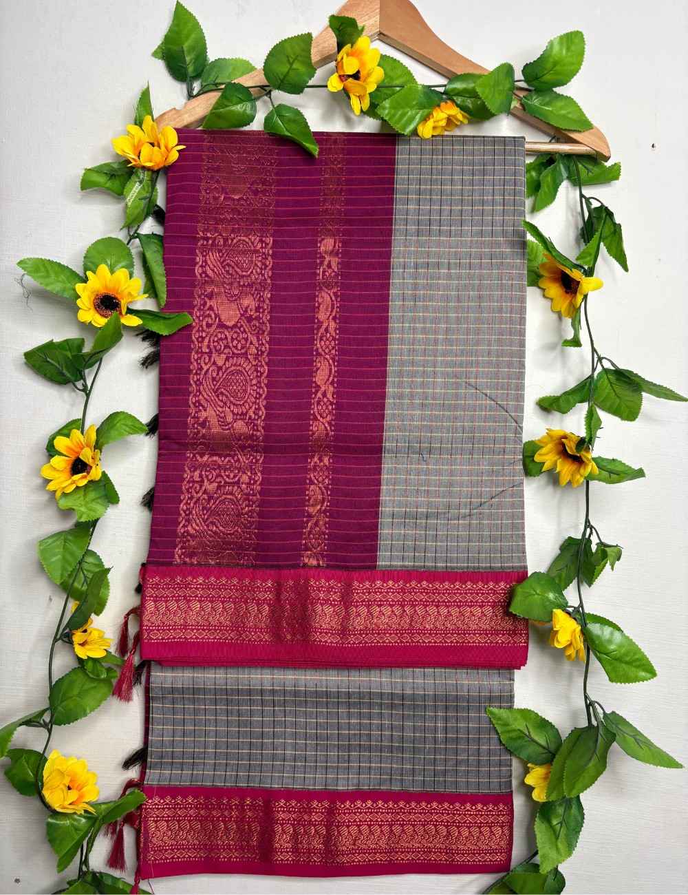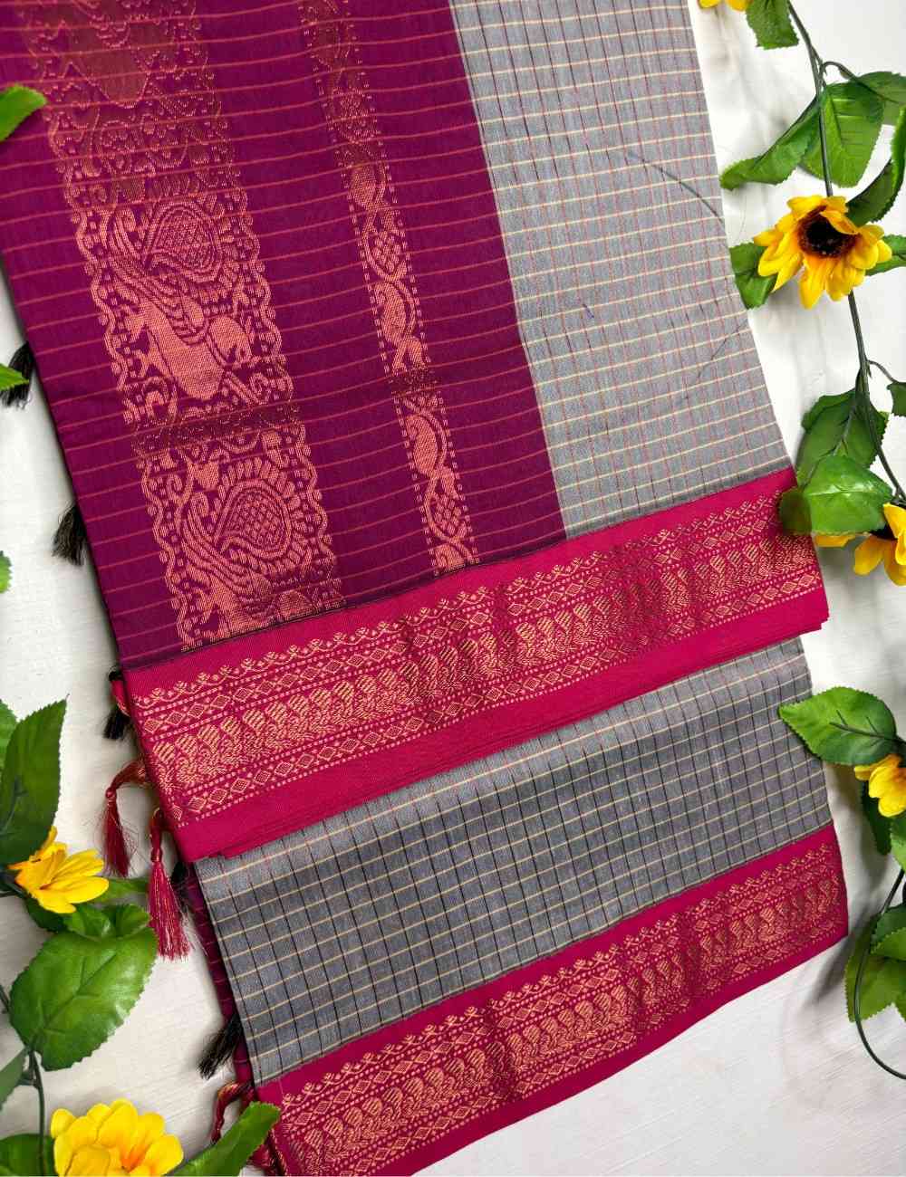 This saree blends subtlety with celebration. The grey body is woven in fine black and white checks, offering a calm, structured base. The dark pink border, richly embroidered with golden zari florals and paisleys, adds a vibrant lift to the muted tone. It’s a saree that feels refined yet festive — ideal for cultural events, temple visits, and elegant daytime occasions.