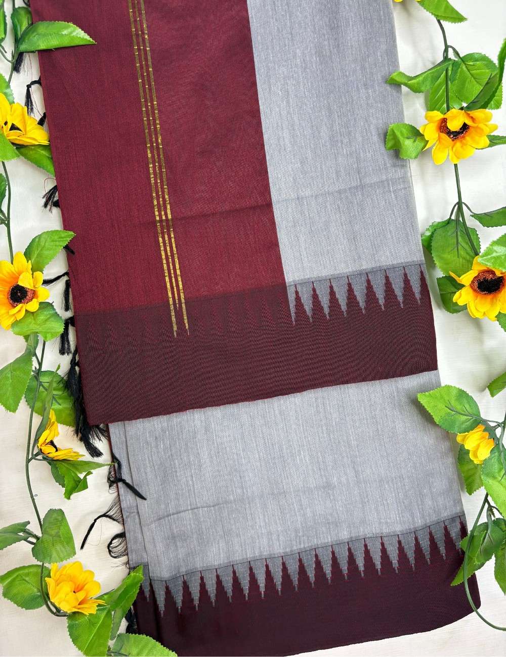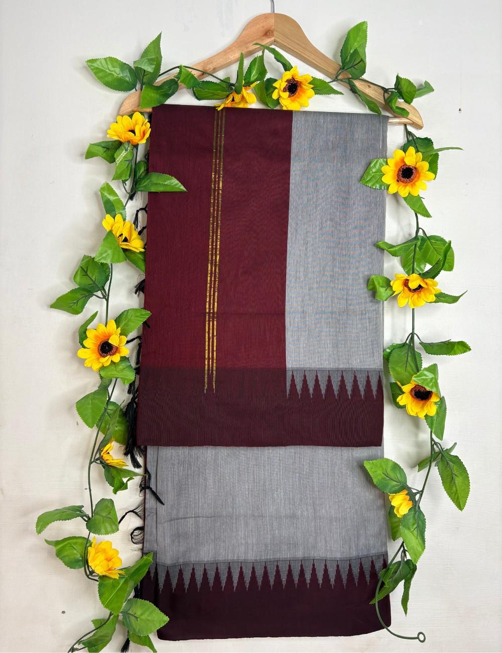 This saree balances understated tones with heritage depth. The grey body offers calm refinement and a modern neutral base, while the maroon korvai temple border adds cultural rhythm and architectural precision. Triangular motifs along the border echo temple gopurams, and fine golden stripes shimmer across the pallu, adding festive charm without overpowering the design.
