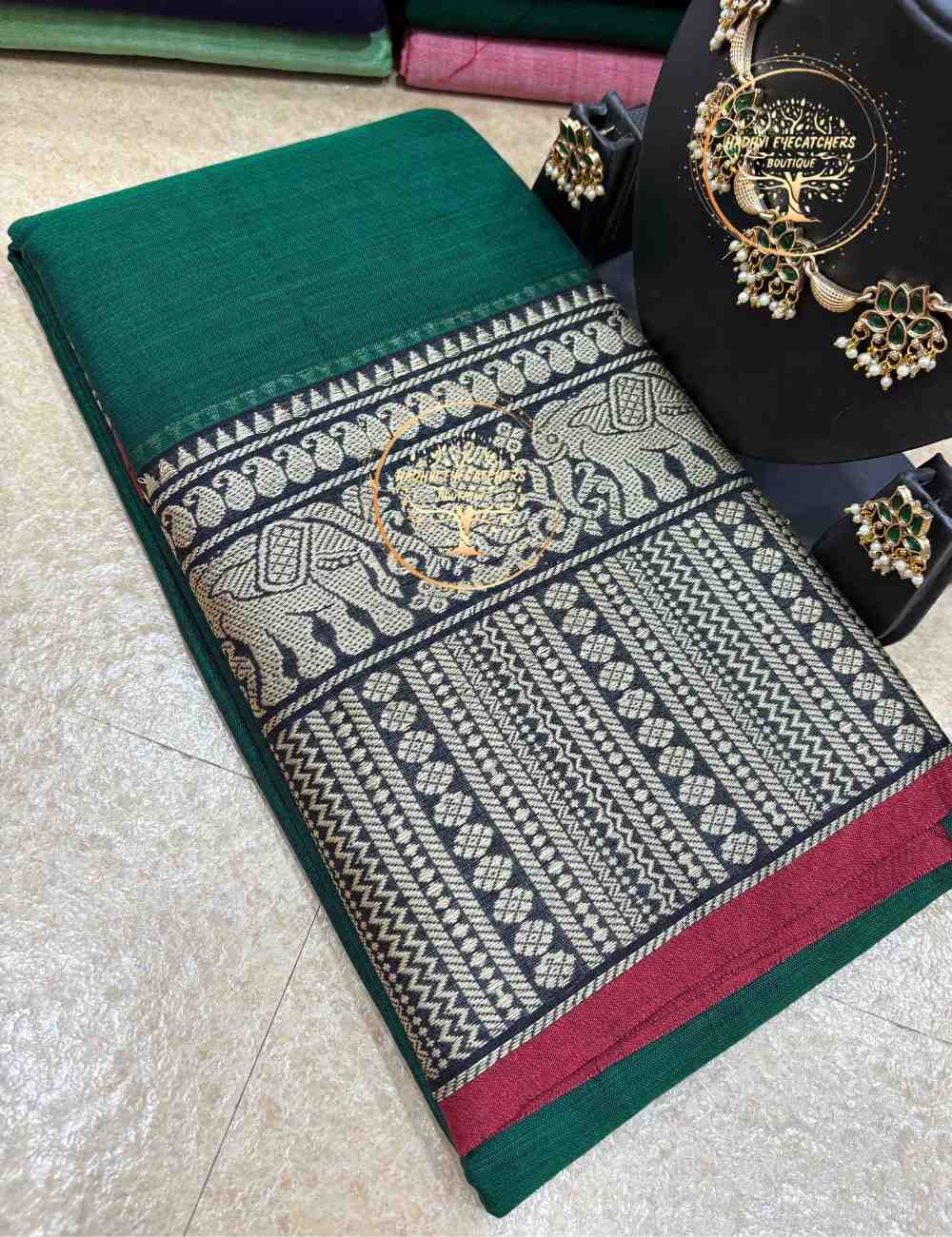 This elegant bottle green Narayanpet cotton saree features a majestic elephant ghajra border. The deep green tone adds richness and heritage appeal. Perfect for traditional and festive wear.