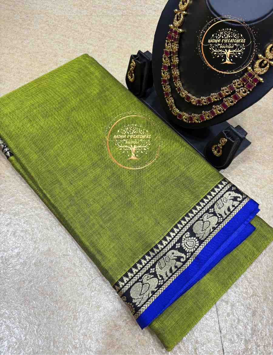 This parrot green Narayanpet cotton saree brings freshness and vibrancy to traditional wear. The pure cotton weave ensures softness and breathability throughout the day. The saree is adorned with a finely woven small elephant border that reflects heritage artistry. A royal blue contrast border adds richness and visual balance.