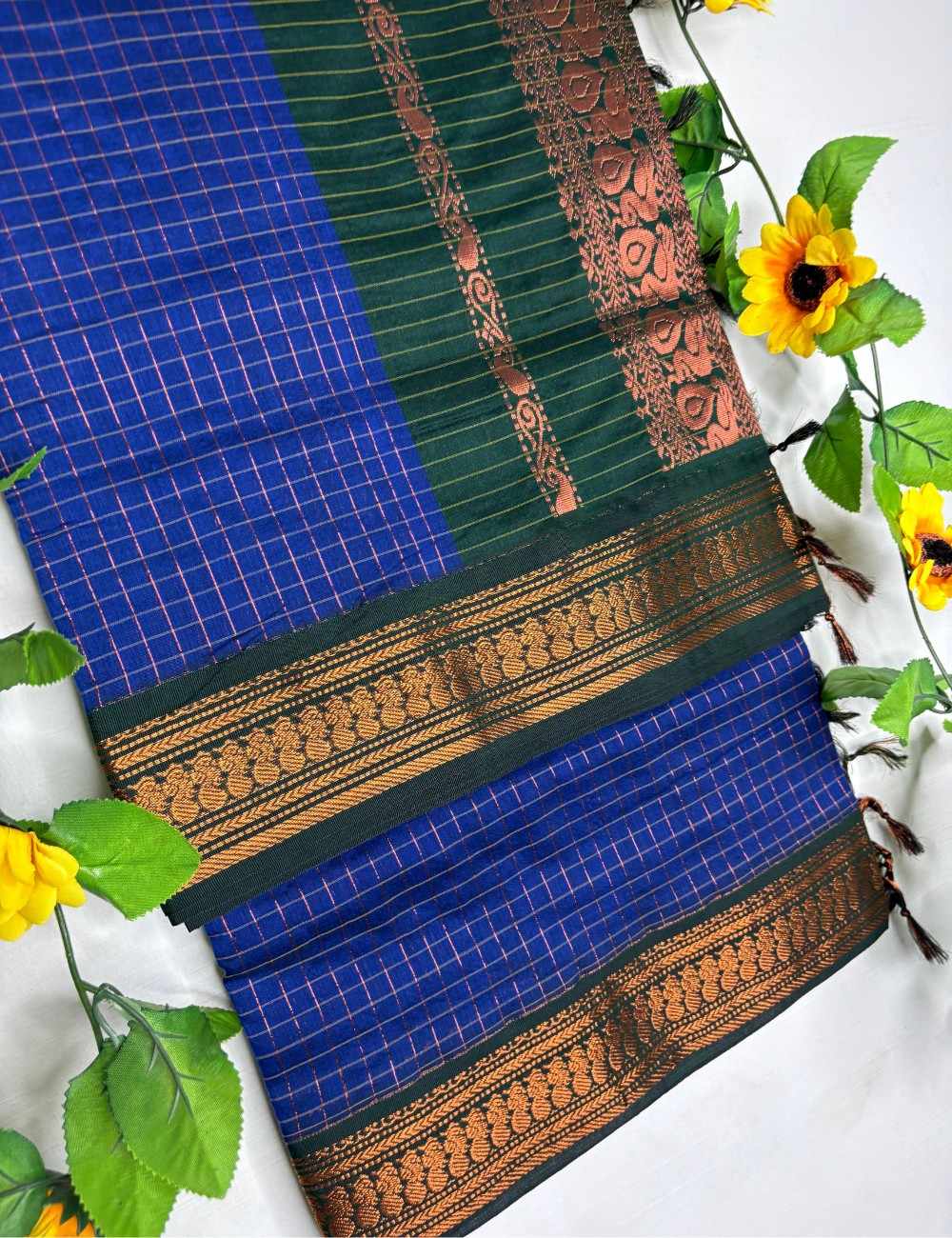 An indigo checks Kalyani cotton saree paired with bottle green blouse. Copper zari border adds bold elegance. Paired with a matching bottle green blouse, this ensemble is perfect for women who love deep tones elevated by heritage craftsmanship.