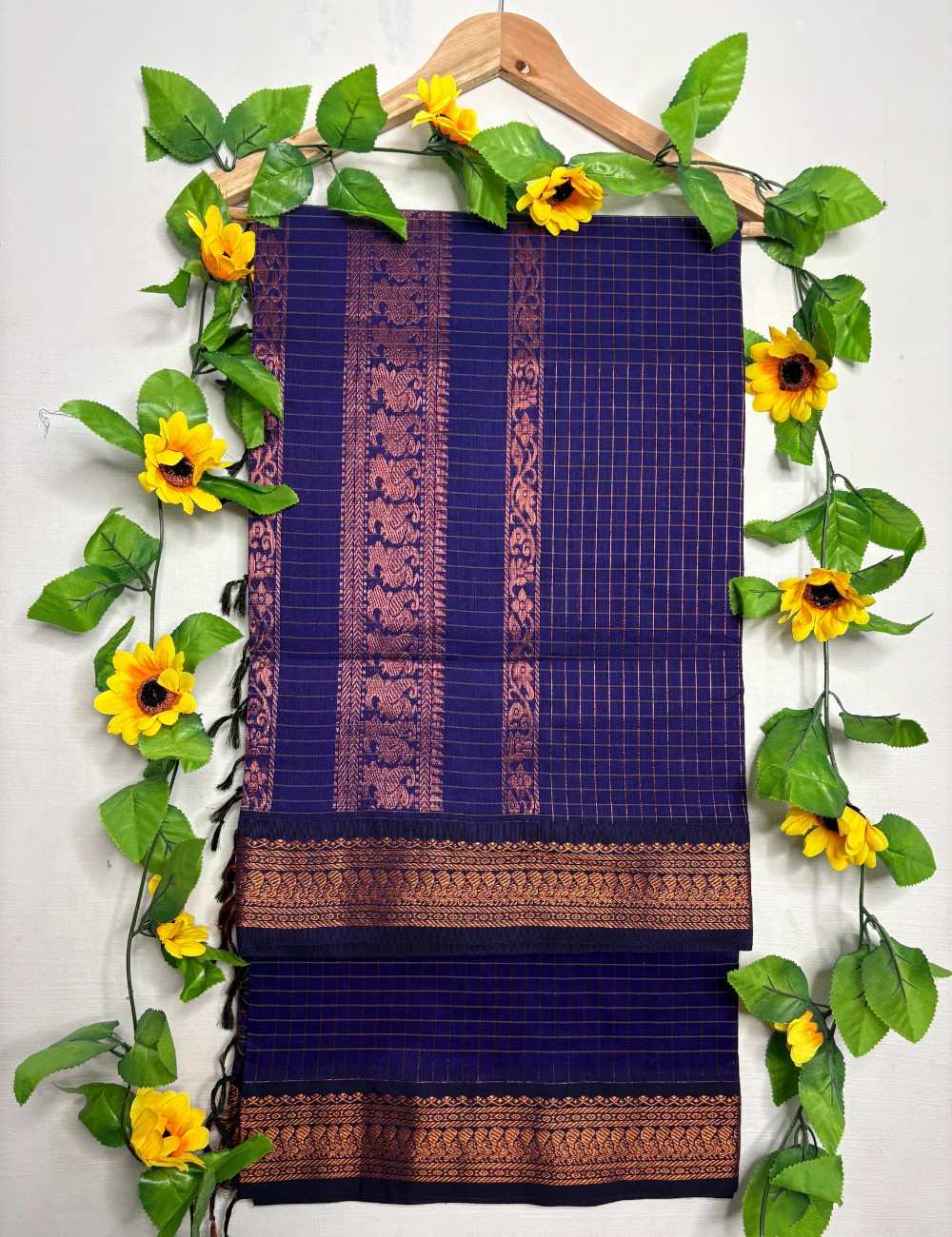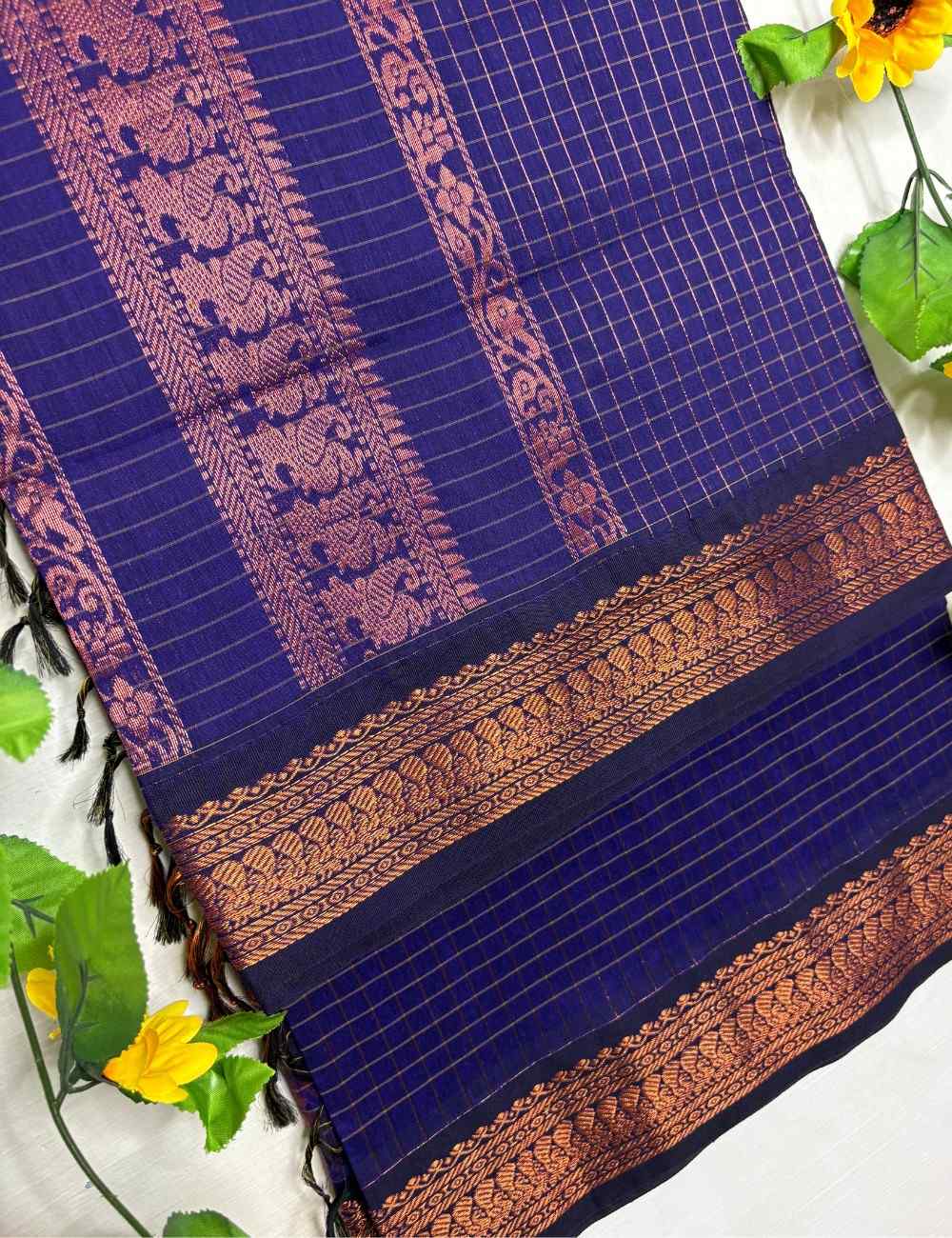 This saree blends twilight tones with festive shimmer. The indigo body features a copper checkered weave in classic Checks Raga Kalyani cotton, while the royal blue border and pallu are adorned with copper zari motifs — florals and leaf patterns that evoke temple grandeur. The layered blues create a harmonious palette ideal for evening wear and cultural occasions. An indigo checks Raga Kalyani cotton saree paired with royal blue blouse. Copper grid body and floral zari border add regal depth.