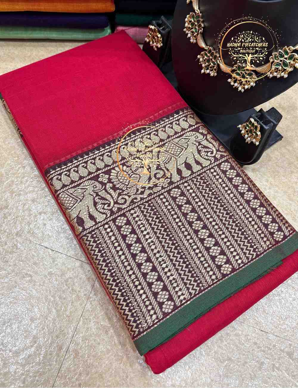 This Deep Red Narayanpet Cotton Saree is bold and elegant. The vibrant red body reflects festive charm. It is paired with a maroon elephant ghajra border. Traditional motifs highlight South Indian craftsmanship.