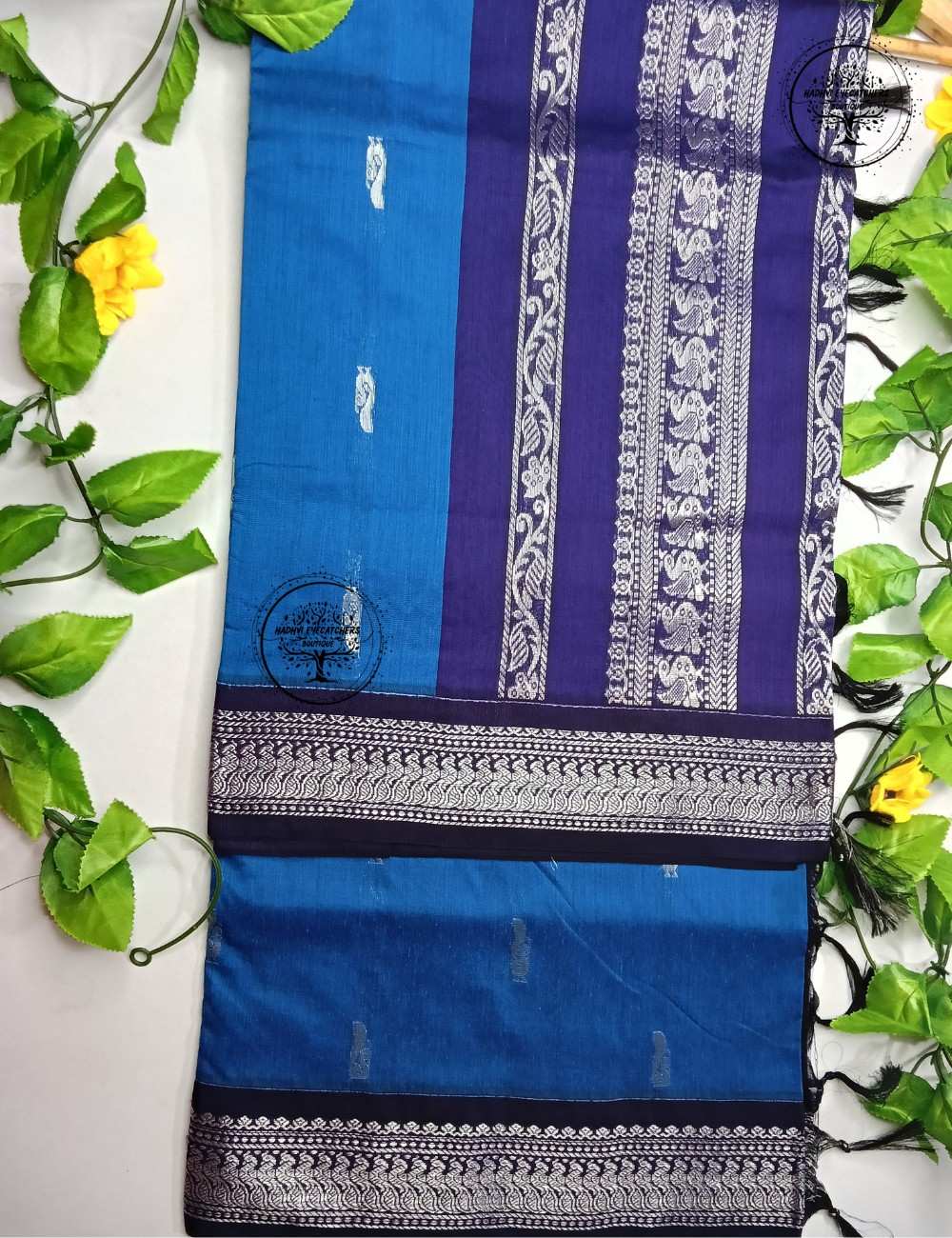 A refreshing blue and navy Kalyani cotton saree with elegant silver zari detailing for timeless everyday wear.