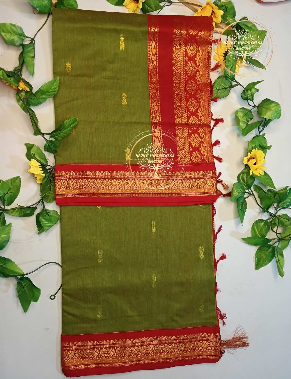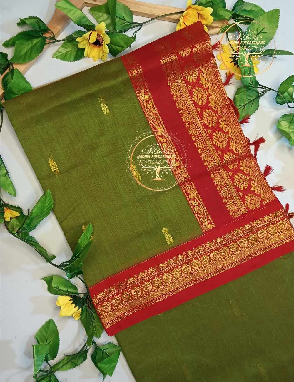 The earthy tone, combined with traditional weaving, makes this saree a timeless addition to your ethnic collection. A refreshing olive green Kalyani Cotton Saree paired with a bold red border and shimmering gold zari.