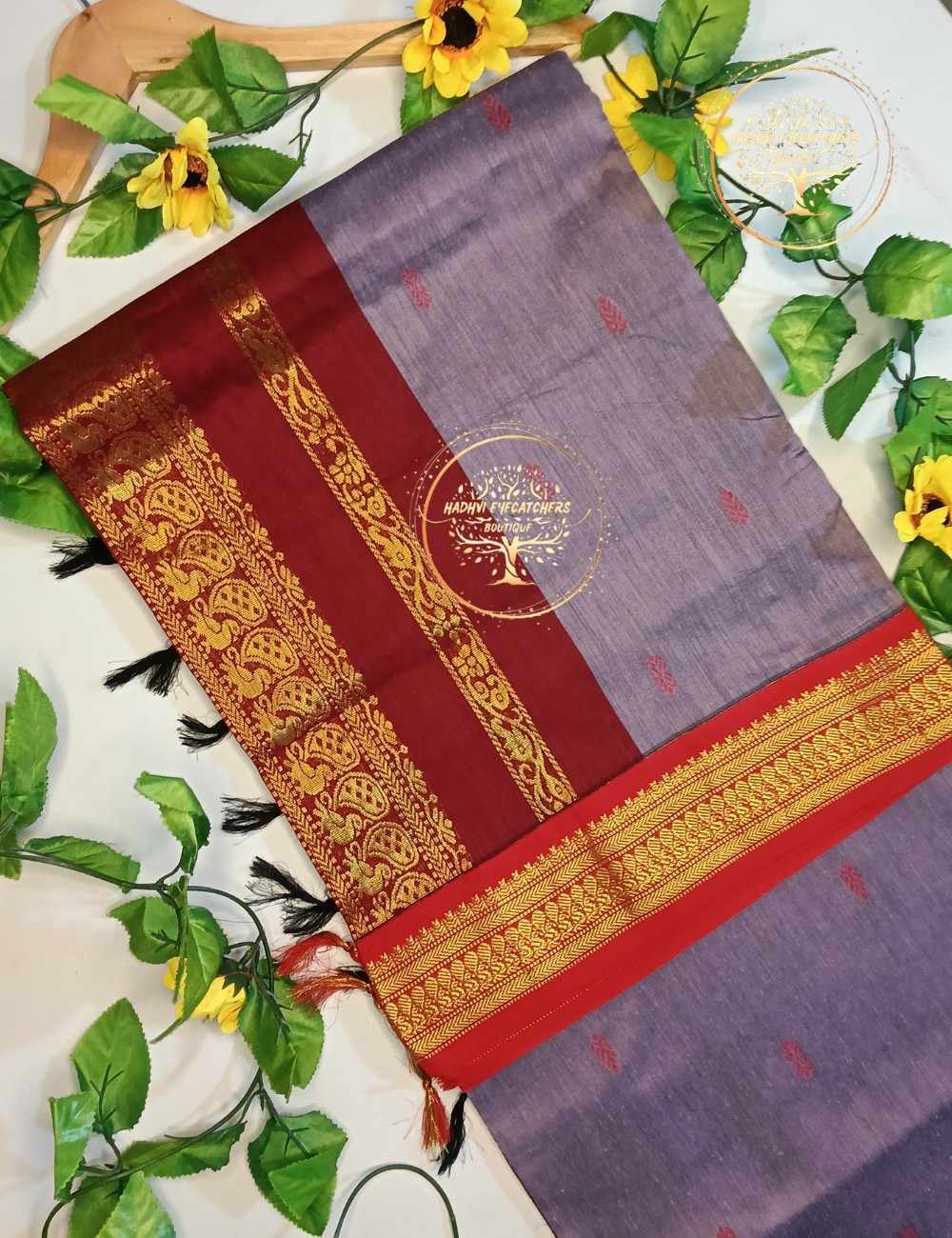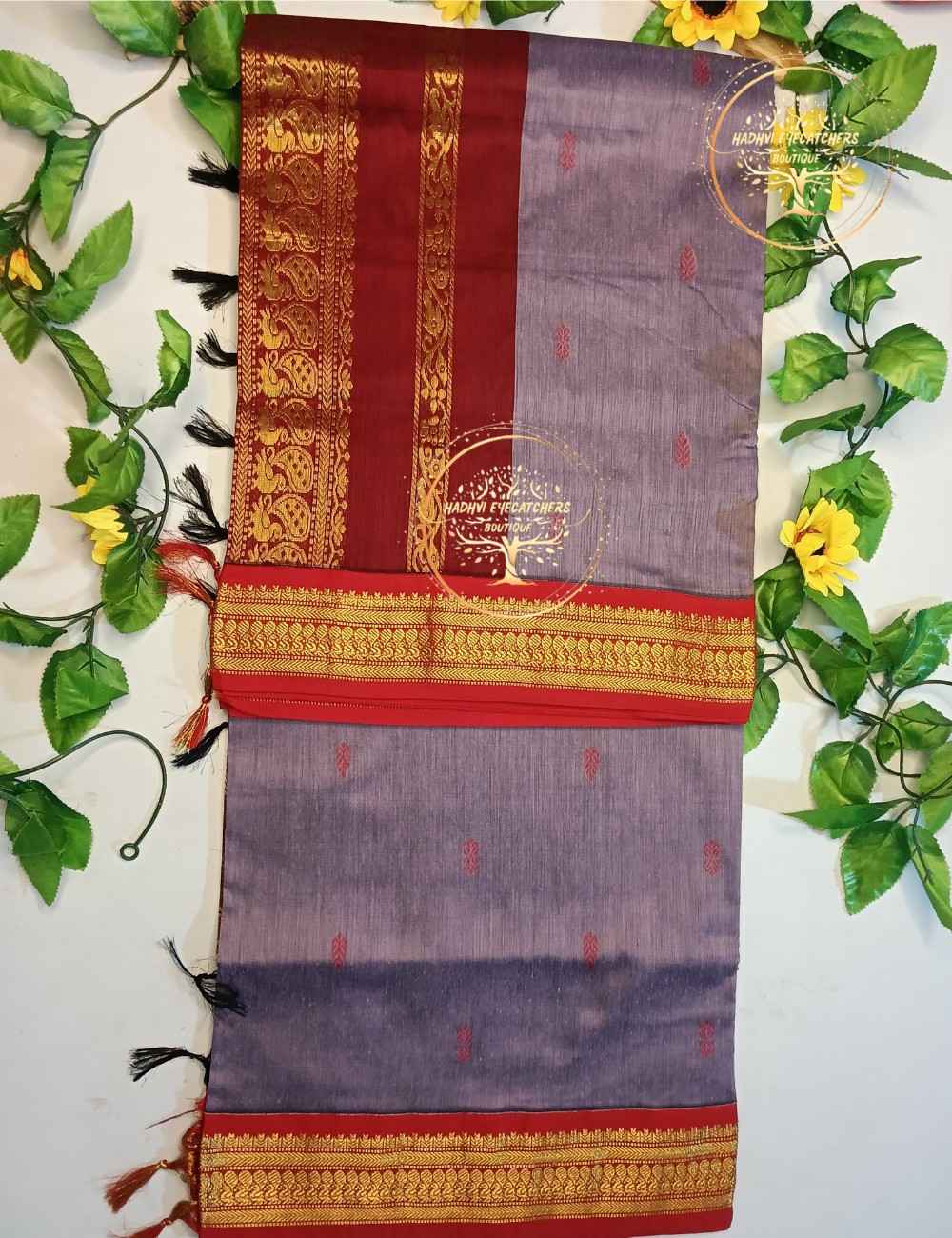 Soft and soothing, this lavender grey Kalyani Cotton Saree is beautifully complemented by a striking red border with intricate gold zari patterns. A graceful saree ideal for those who prefer subtle elegance with a traditional touch. South Indian appeal. Crafted from breathable Kalyani cotton, this saree is lightweight, easy to drape, and ideal for long hours of wear during daily routines or festive occasions.