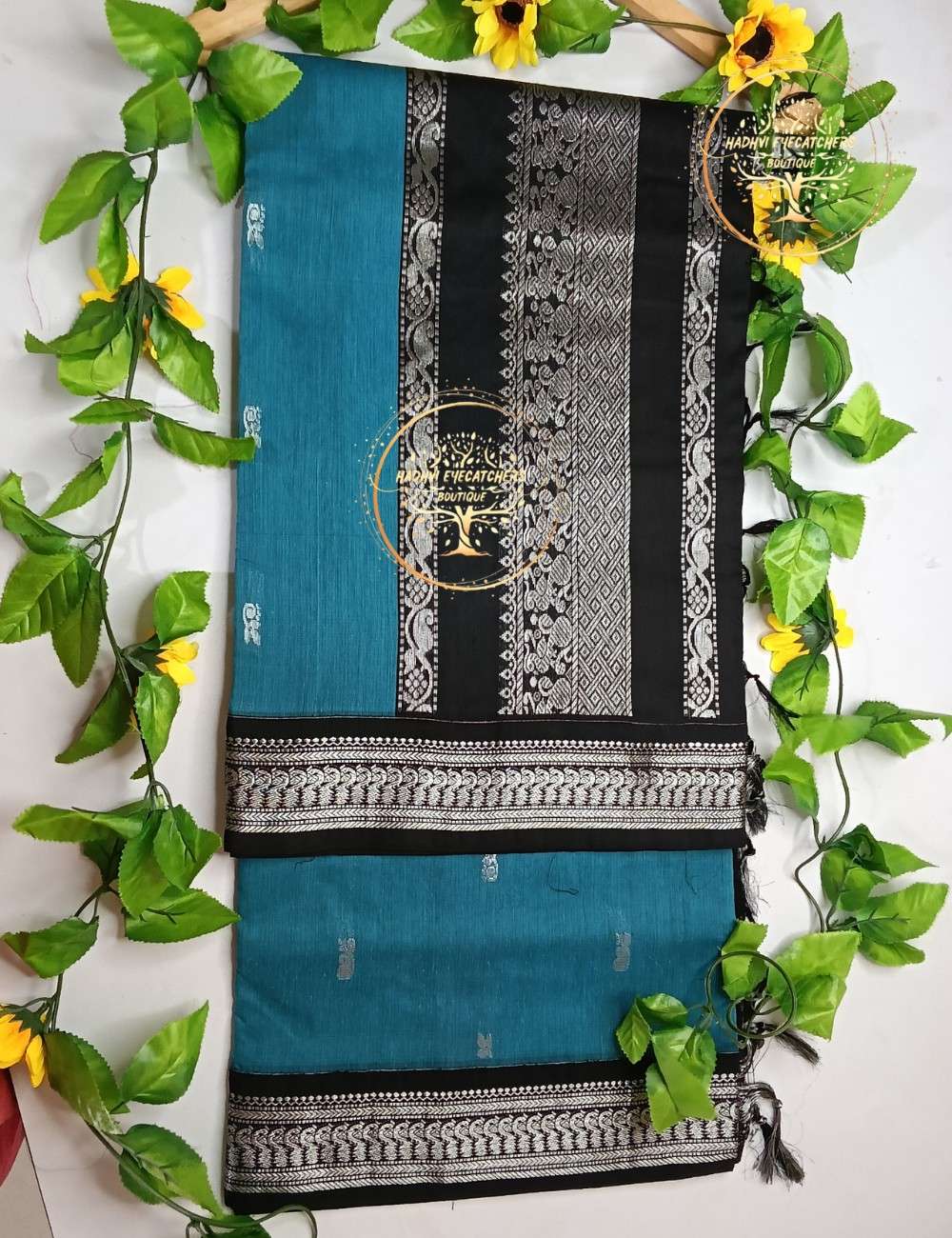 Step into understated luxury with our handcrafted Kalyani cotton saree, woven from 100% vegan cotton. The body showcases a serene teal blue hue, contrasted by a bold black border embellished with silver zari floral and geometric patterns — a tribute to traditional South Indian artistry.