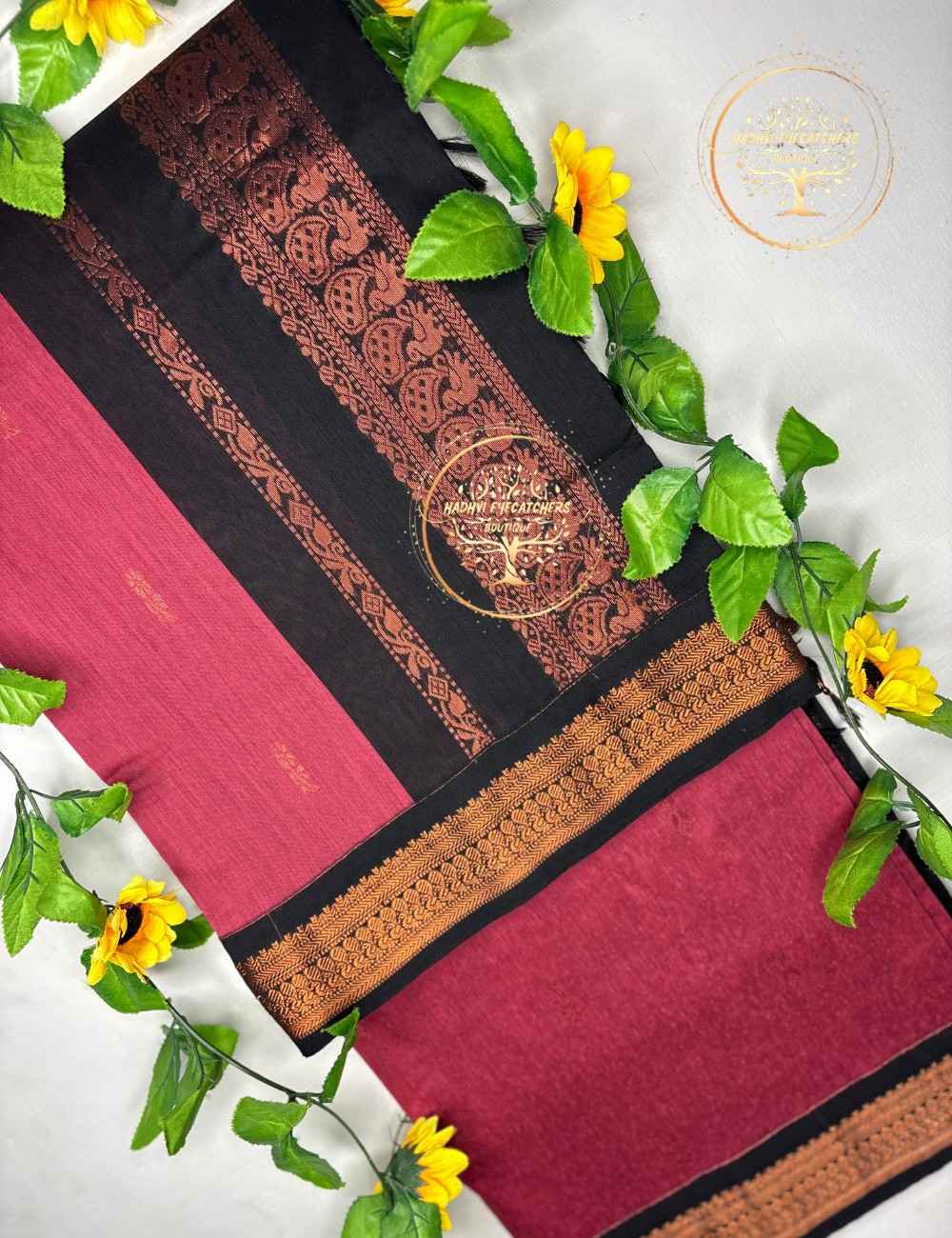 This beautiful Kalyani Cotton Saree in an elegant deep rose pink shade offers a perfect balance of richness and everyday comfort. Woven from high-quality Kalyani cotton, the saree feels soft on the skin and allows easy movement throughout the day. The saree is highlighted with a bold black border intricately designed with traditional copper zari weaving, giving it a refined ethnic finish. Subtle woven buttas on the body add grace without overpowering the overall look. This Kalyani cotton saree with black copper zari border is ideal for office wear, poojas, casual festive occasions, and traditional day functions.