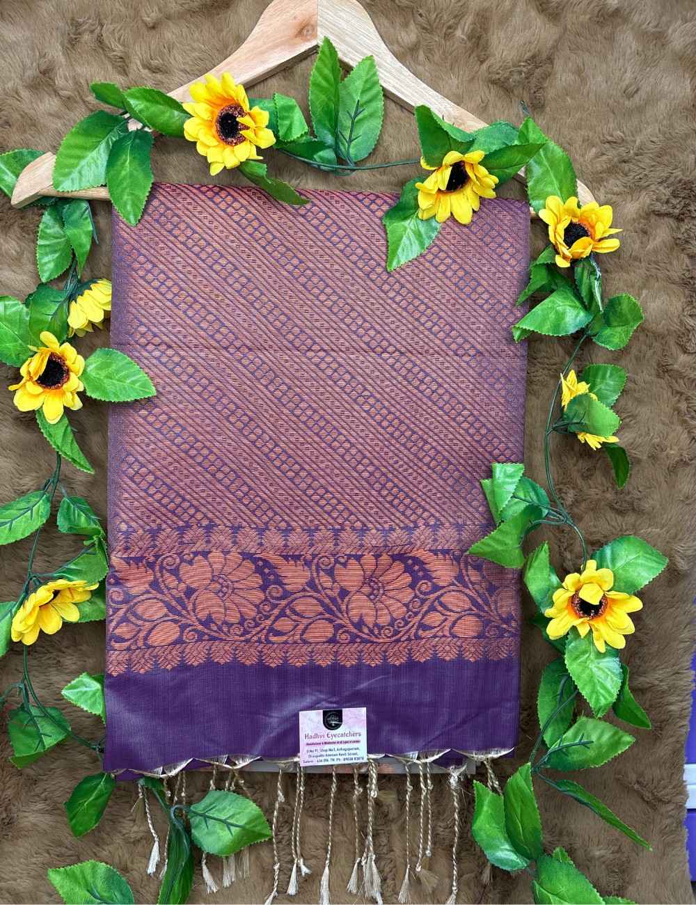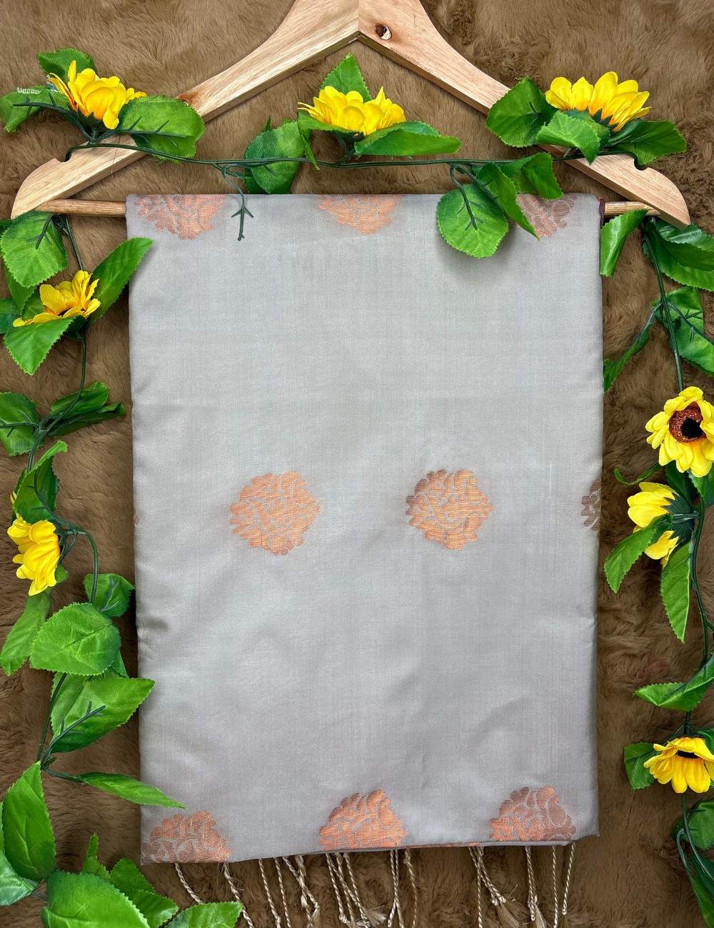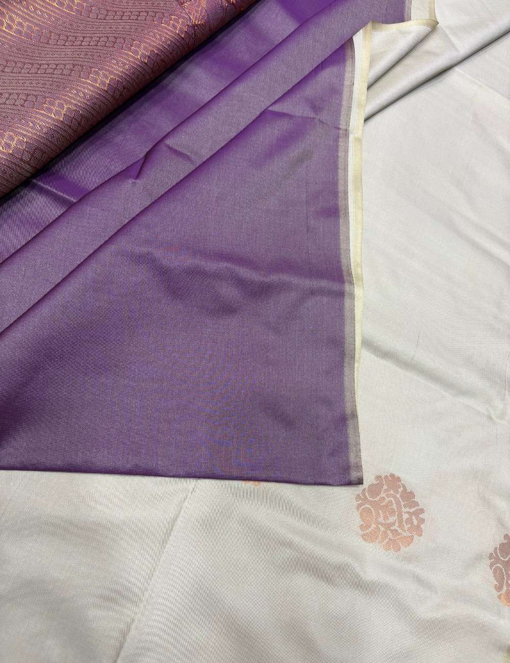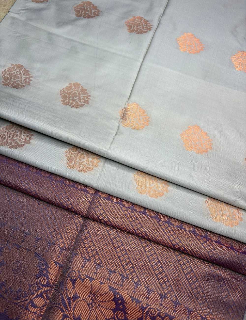 This saree captures the essence of refined tradition with its soft grey body, delicately patterned with copper floral motifs that evoke nature’s rhythm. The lower half transitions into a regal violet, embellished with intricate copper vines and ornamental flourishes that lend grandeur and movement.