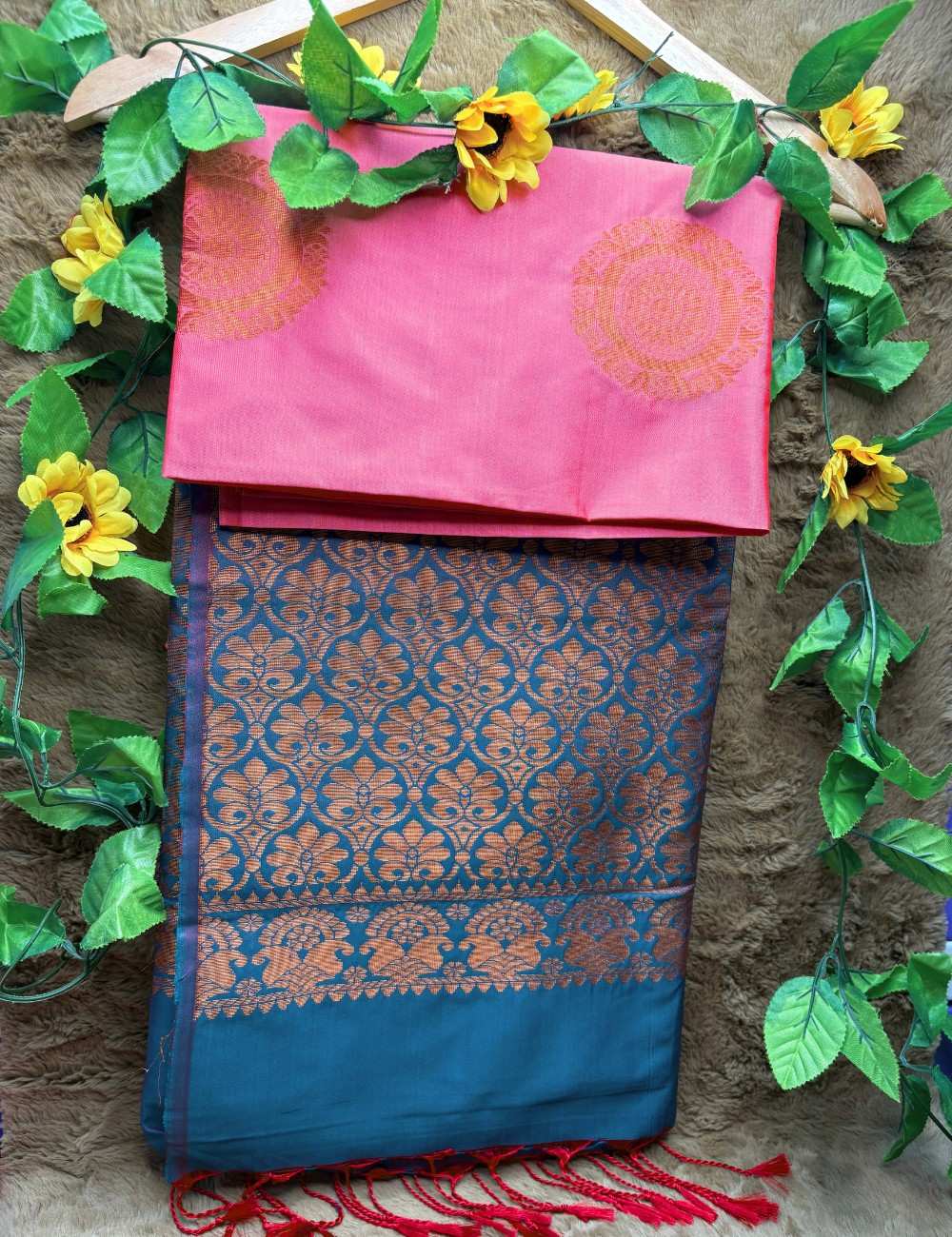 Ideal for weddings, receptions, and festive evenings, this Raga soft silk saree is a graceful interplay of color and craftsmanship. Red tassels at the edge add a joyful finish to this elegant ensemble.