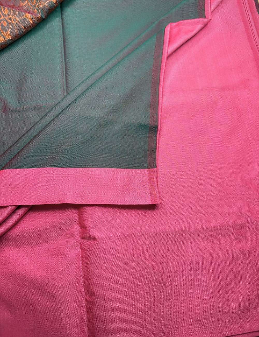 This saree blends softness and richness through its double-toned lotus pink body, adorned with circular gold zari motifs that evoke rhythm and radiance. The pallu shifts into a deep blue canvas, intricately woven with floral and paisley designs in luminous gold zari — a regal contrast that elevates the silhouette.