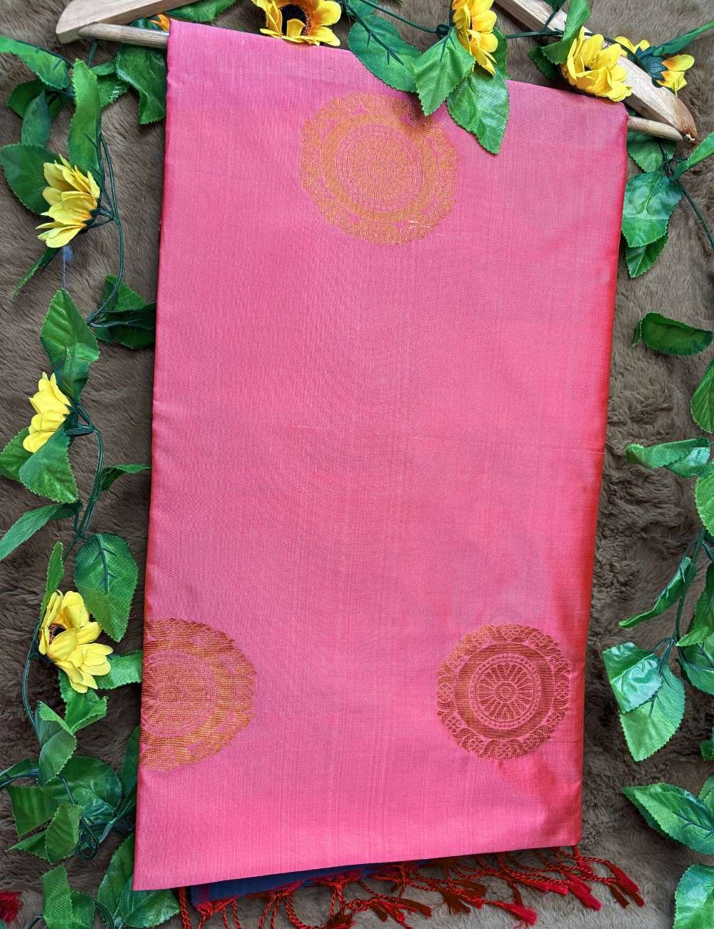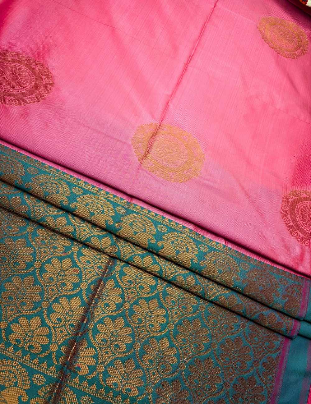 This Raga soft silk saree features a double-toned lotus pink body with circular gold zari motifs that shimmer with festive charm. The deep blue pallu is richly woven with floral and paisley patterns in gold zari, adding contrast and grandeur. Red tassels complete the drape with a vibrant flourish, perfect for celebratory occasions.