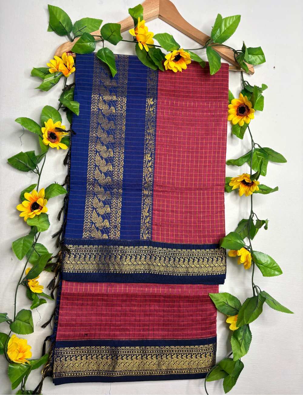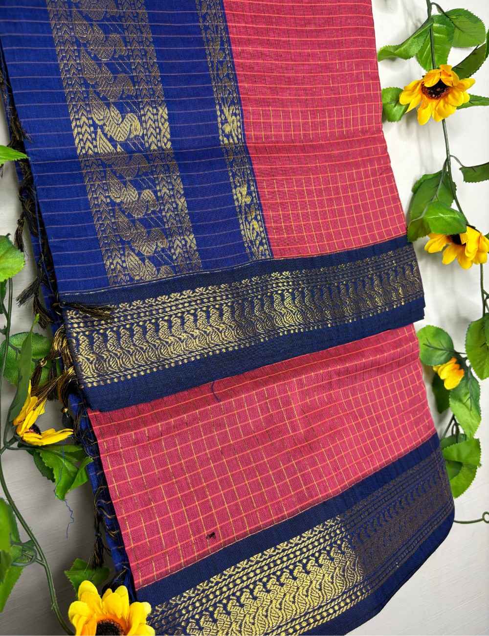This saree blends floral elegance with regal tradition. The lotus pink body features a golden checkered weave in classic Checks Kalyani cotton, offering a graceful and celebratory tone. The royal blue border and pallu are richly adorned with gold zari motifs — florals, vines, and paisleys that evoke temple artistry and festive grandeur. The soft pink paired with deep royal blue creates a refined palette ideal for weddings, cultural events, and joyful occasions.