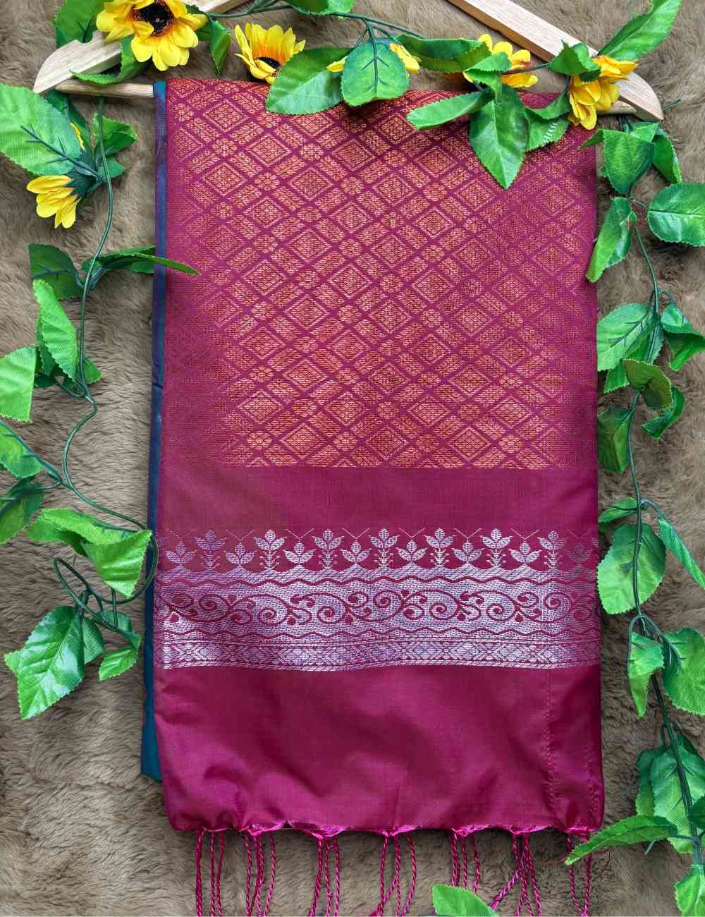 A maroon border with silver scrollwork frames the saree with finesse. Ideal for weddings, receptions, and cultural festivities, this saree blends feminine charm with heritage grandeur.