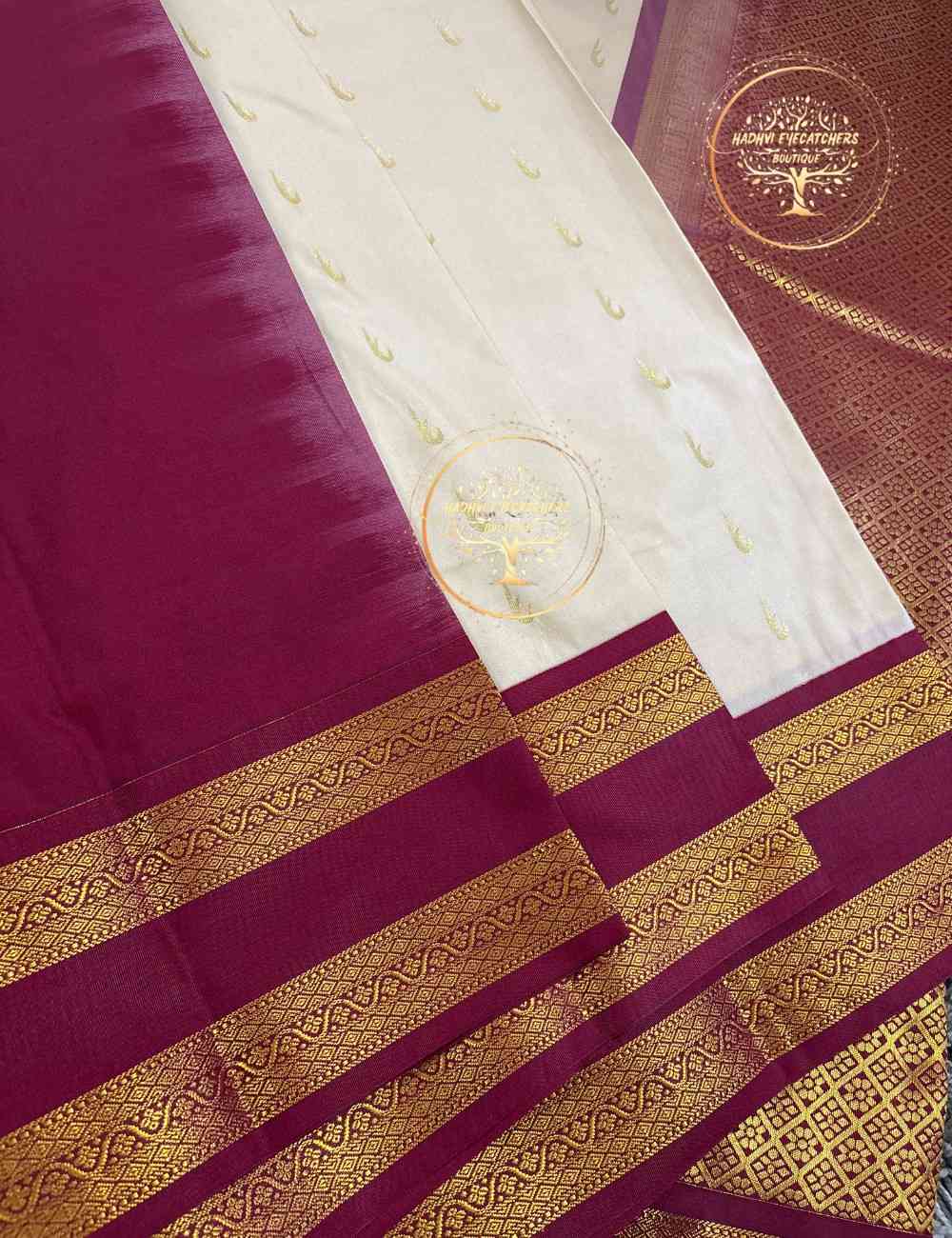 This elegant Beige Kanchi Soft Silk Saree features a soft beige body highlighted with delicate gold zari buttas that add subtle traditional charm. The saree is beautifully finished with a rich maroon border woven in intricate gold zari, giving it a classic Kanchipuram appeal.