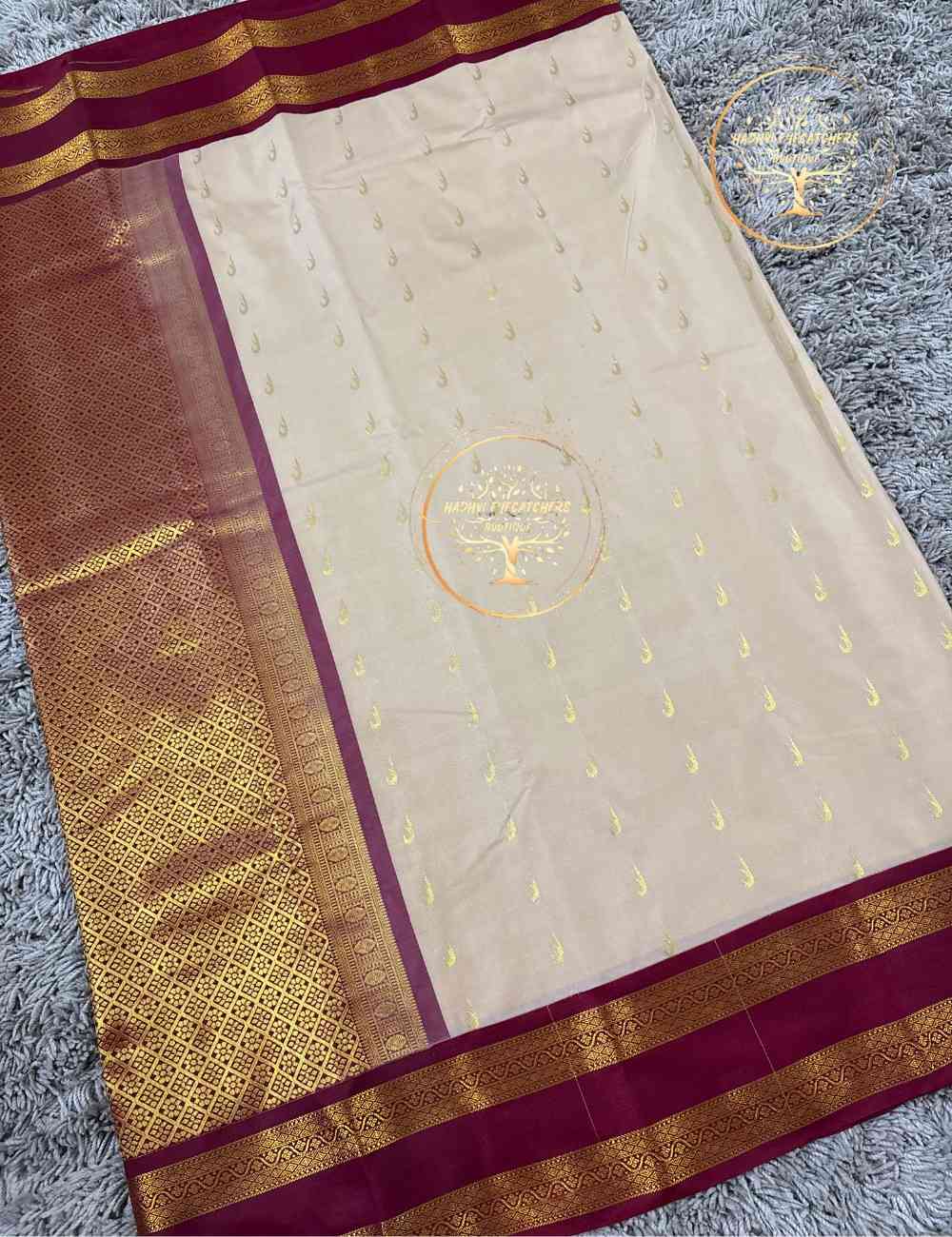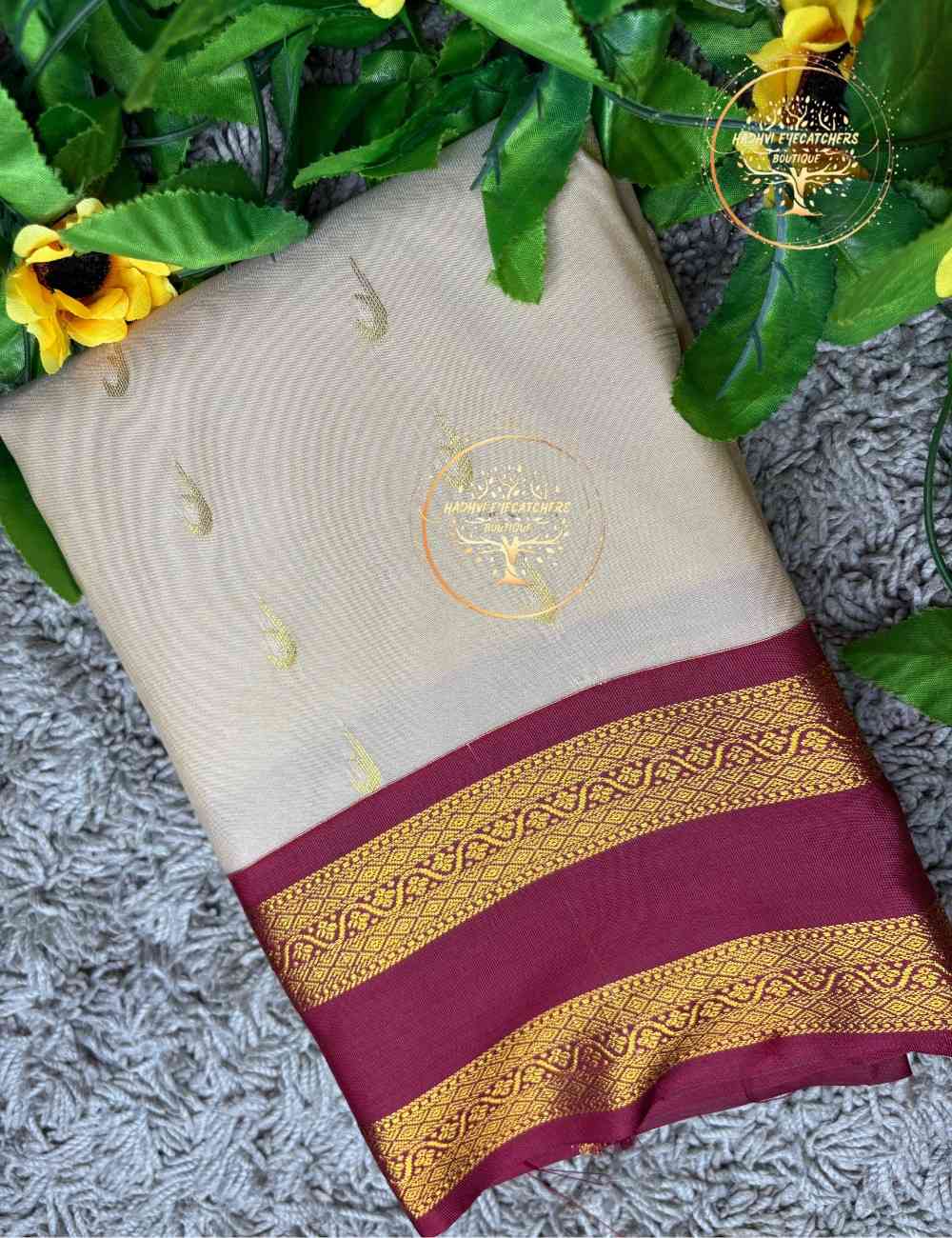 This elegant Beige Kanchi Soft Silk Saree features a soft beige body highlighted with delicate gold zari buttas that add subtle traditional charm. The saree is beautifully finished with a rich maroon border woven in intricate gold zari, giving it a classic Kanchipuram appeal. Crafted from premium soft silk, it offers a smooth texture, graceful drape, and luxurious sheen suitable for long festive wear. The contrast maroon border enhances the neutral beige body, making the saree both refined and eye-catching. Ideal for weddings, festive celebrations, poojas, and traditional functions, this saree reflects timeless South Indian craftsmanship. Pair it with antique gold jewellery for a regal and elegant look.