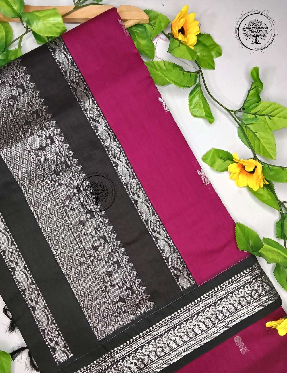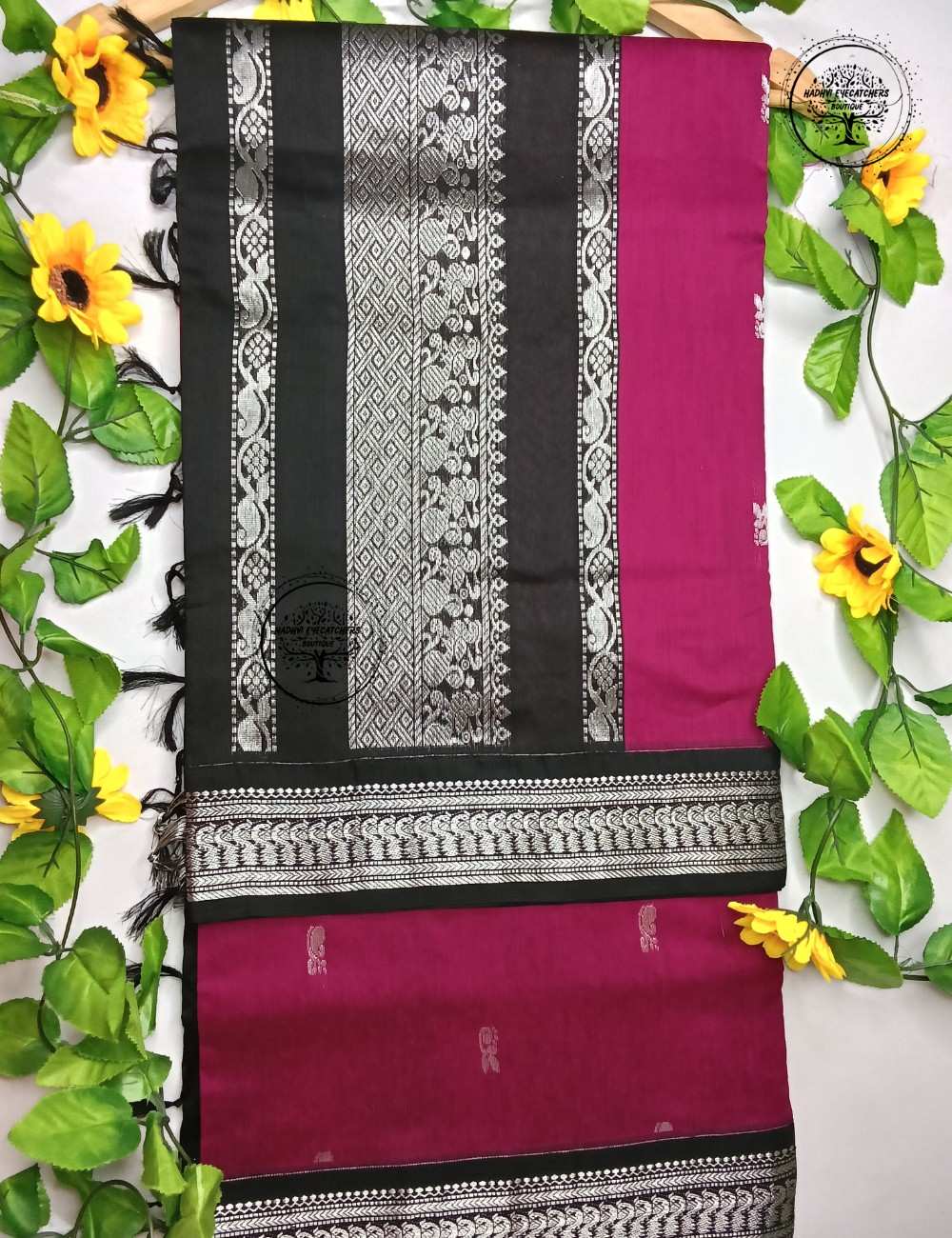 This Magenta Kalyani Cotton Saree is a perfect blend of comfort and traditional elegance. The vibrant magenta body is beautifully complemented by a bold black border, intricately woven with classic silver zari motifs. Subtle woven buttas across the body enhance the overall richness while keeping the look graceful and understated.