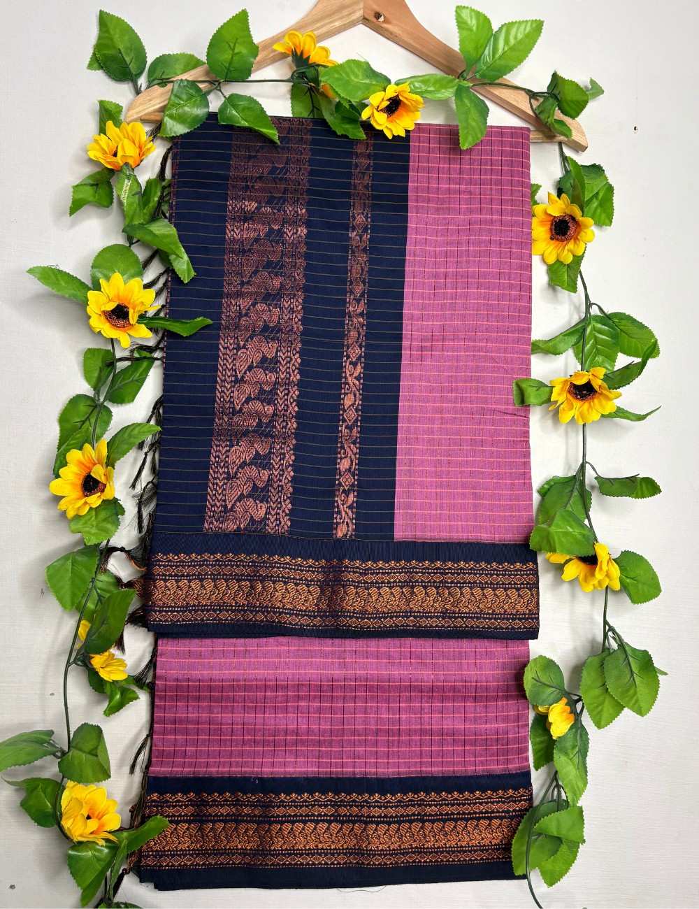 This saree blends jewel-toned vibrance with regal elegance. The magenta body features a golden checkered weave in classic Checka Kalyani cotton, offering a bold and celebratory tone. The rettapet navy blue border and pallu are richly adorned with copper-toned zari motifs — florals, vines, and geometric patterns that evoke temple artistry and festive grandeur. The deep contrast between magenta and navy blue creates a striking palette ideal for weddings, cultural events, and joyful occasions.