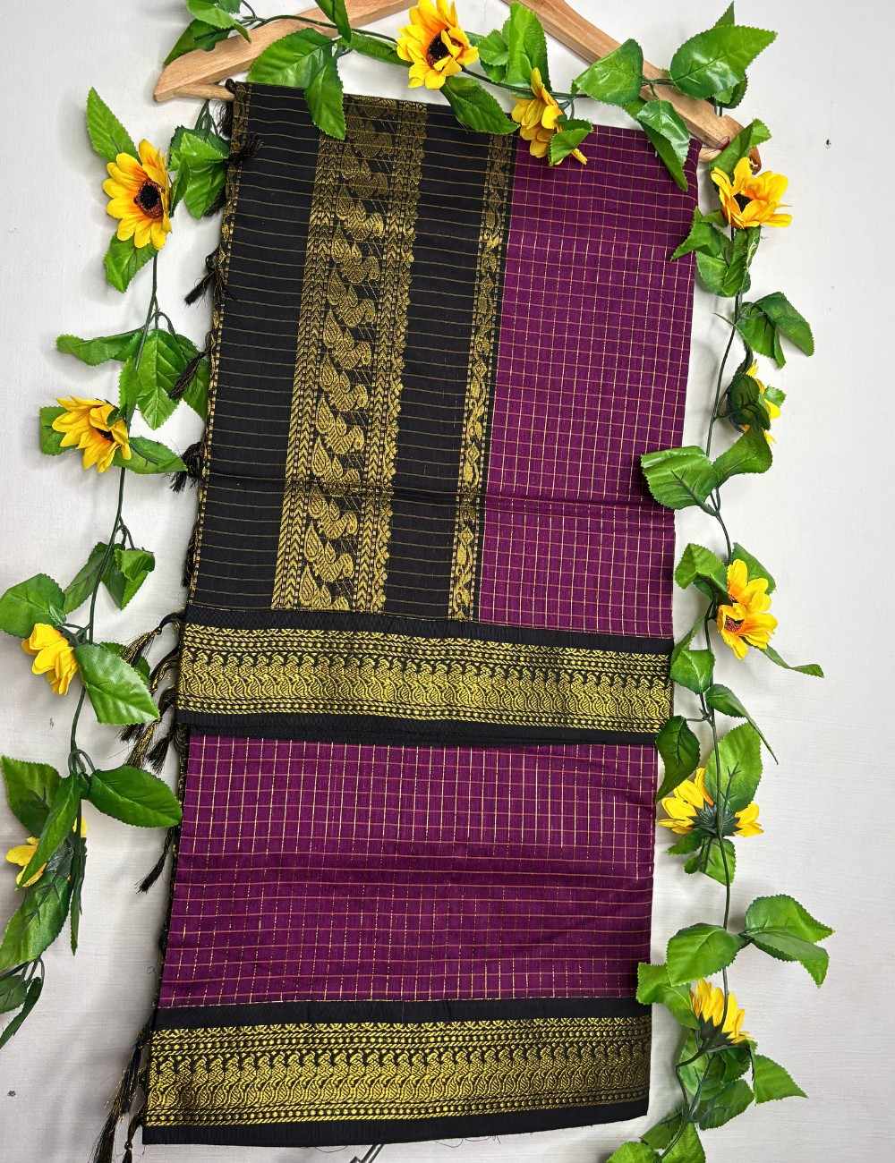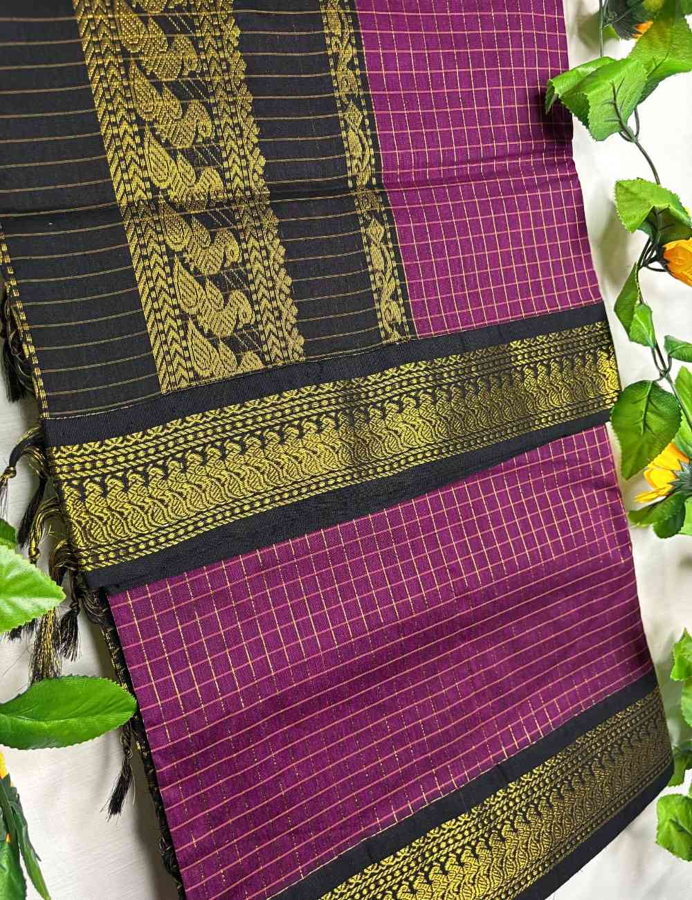 Magenta saree with golden grid checks and black borders. Intricate floral and paisley motifs add richness. Soft, durable acrylic cotton for festive elegance.