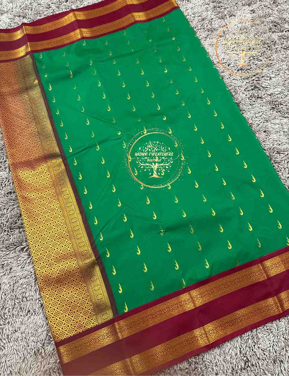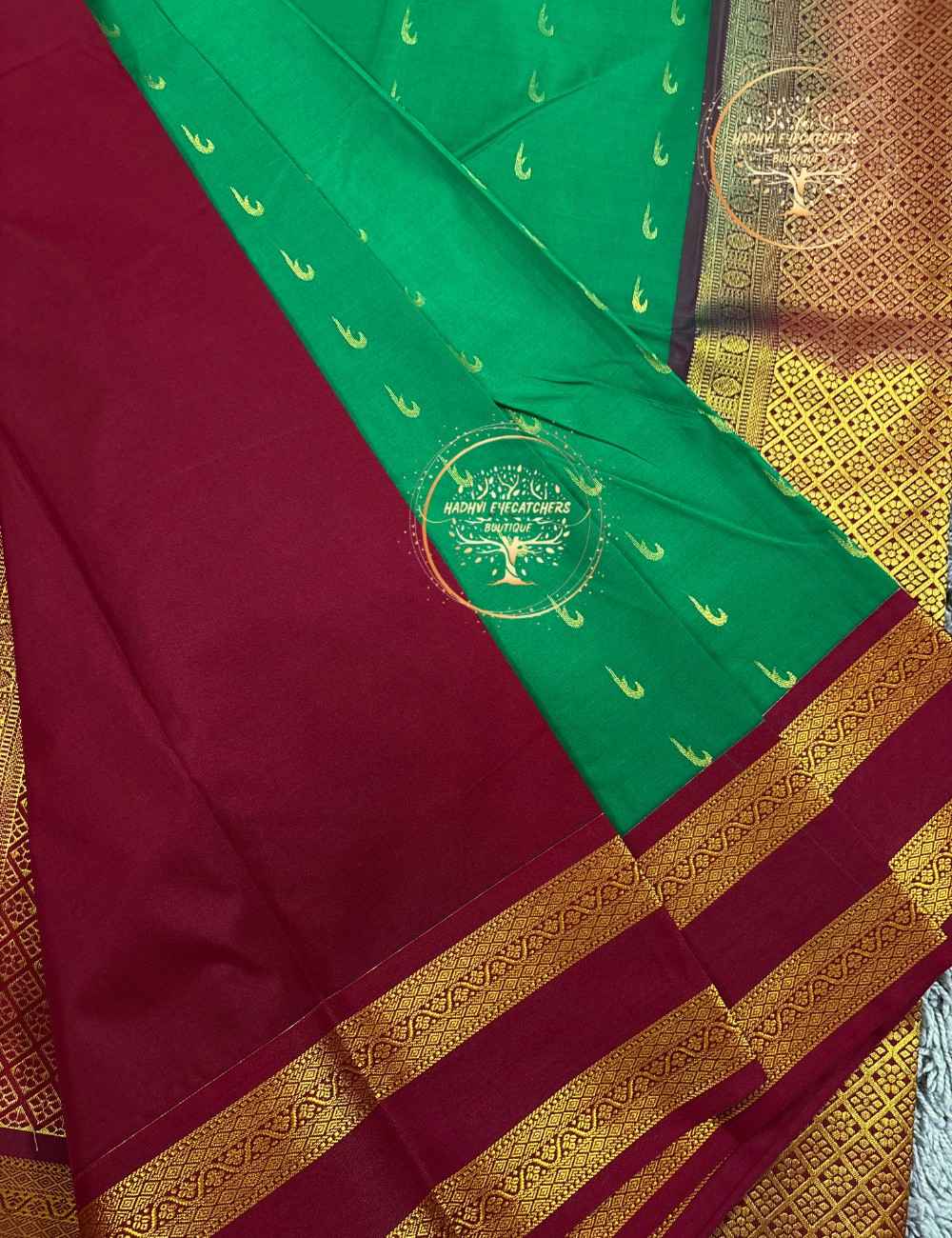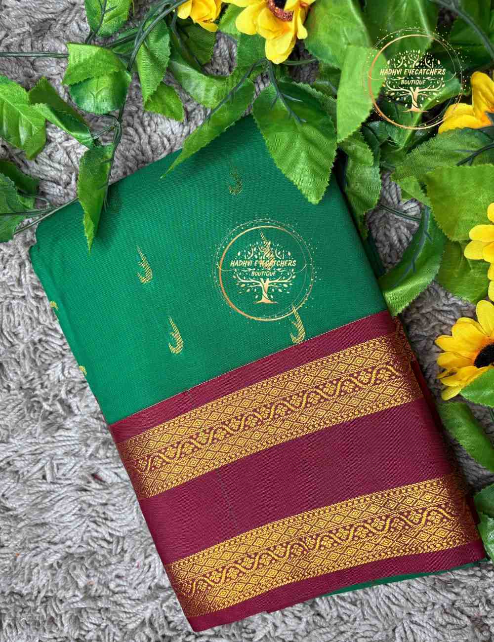 This beautiful Kanchi Soft Silk Saree in a vibrant leaf green shade exudes traditional elegance and festive charm. Crafted from premium soft silk, the saree offers a lustrous finish and a graceful flow. The body is embellished with fine gold zari motifs that add subtle detailing to the rich green base. A contrasting maroon border featuring classic gold zari weaving enhances the saree’s visual appeal and traditional character. The pallu mirrors the border’s zari design, giving the saree a well-balanced and luxurious finish. This Kanchi soft silk saree is ideal for festive celebrations, weddings, and cultural events.