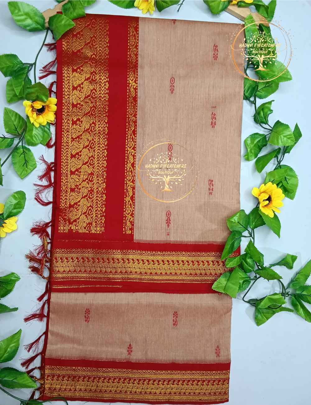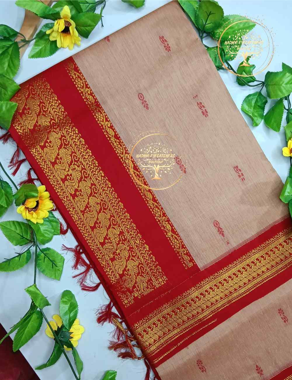 This beautiful beige Kalyani Cotton Saree highlights simplicity and tradition. The rich red border with gold zari weaving adds a regal finish, making it suitable for elegant daytime functions and traditional events.