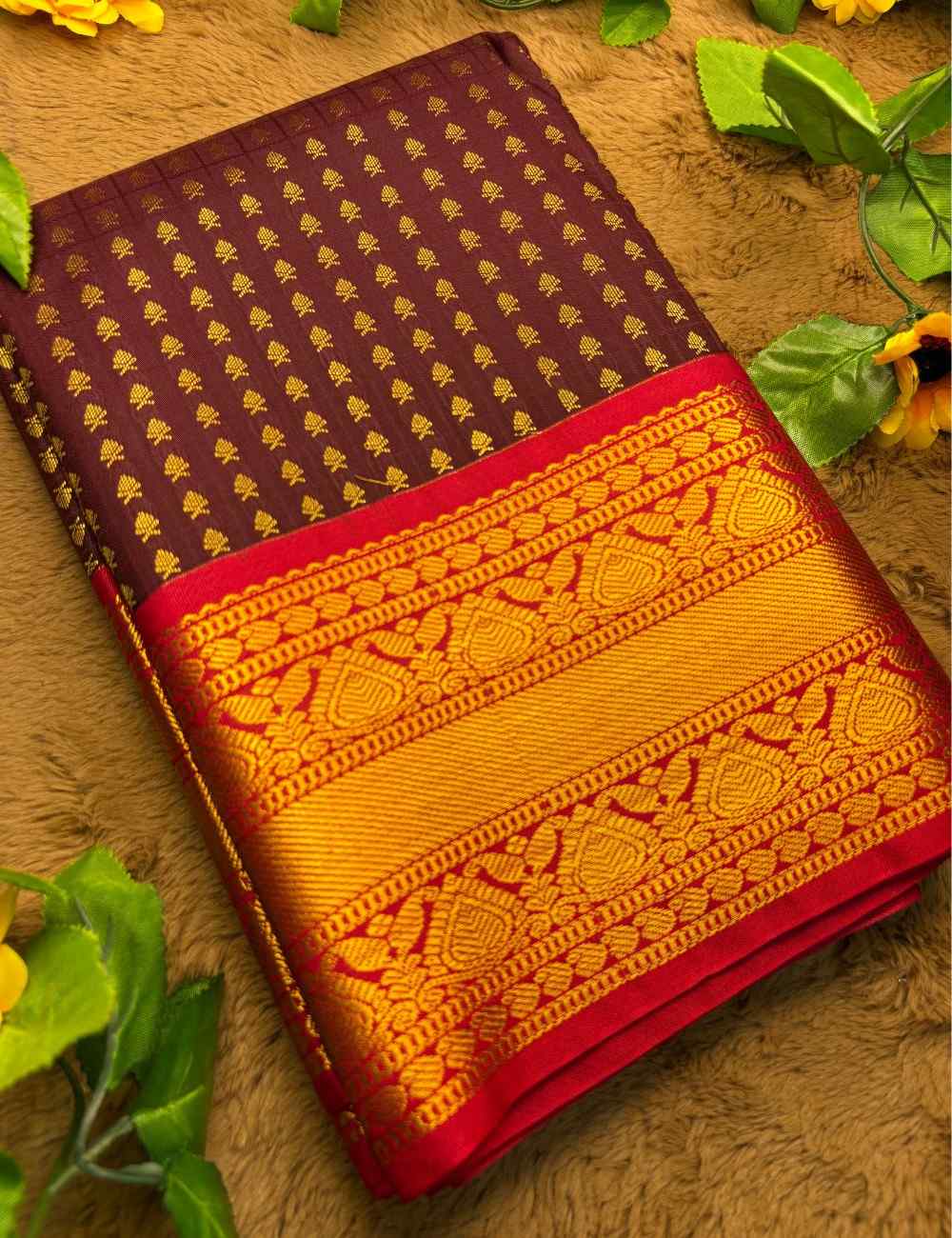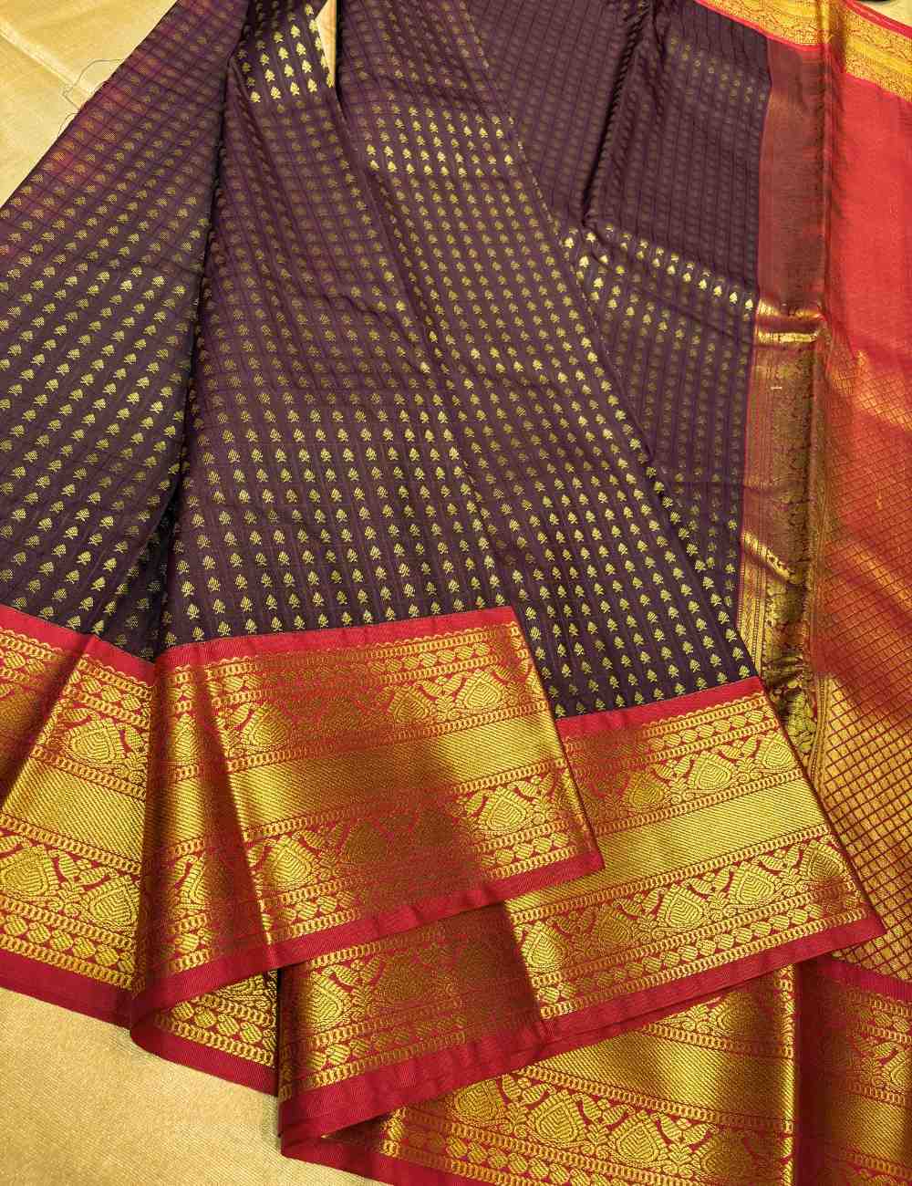 This Lakshadeepam saree features a deep maroon body adorned with golden buttas arranged in a grid. The Semi Kanchi Silk weave adds richness and depth, making the motifs shimmer with elegance and ceremonial charm.